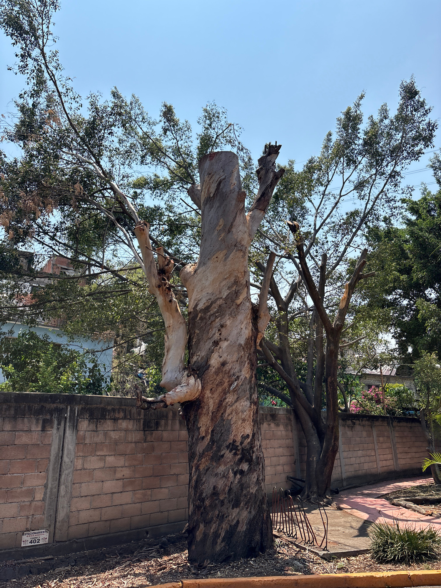 The image depicts a large, partially pruned tree in an urban setting. The tree, with significant portions of its trunk exposed, stands beside a brick wall and a paved walkway. In the background, lush…read more