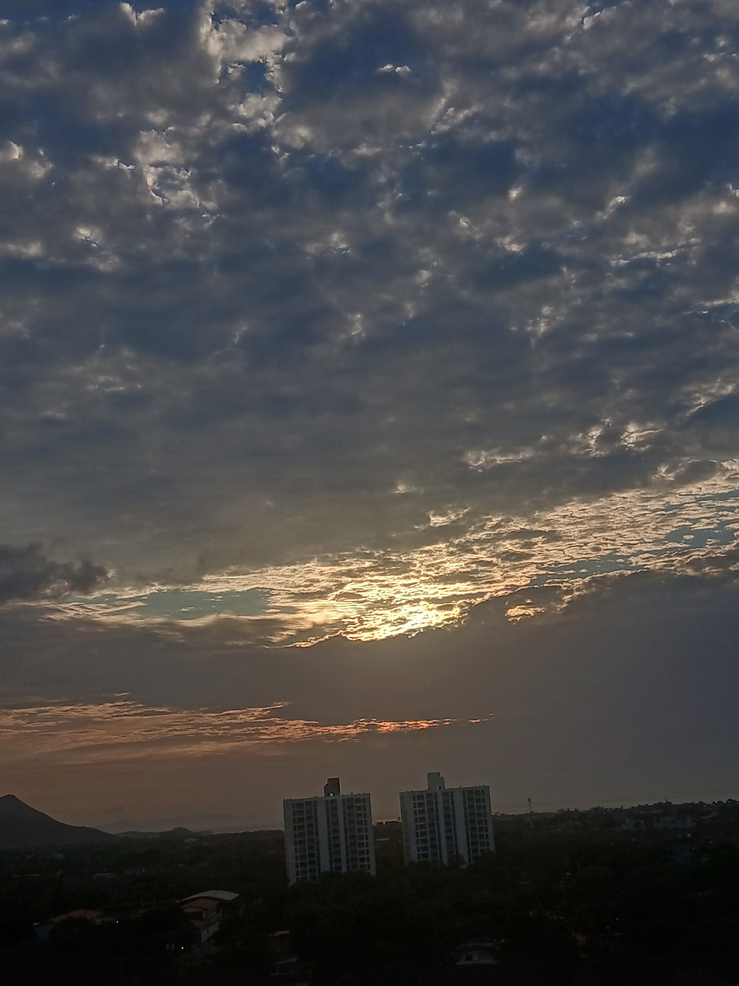 The image shows a sunset over the city of Juan Griego, Venezuela. The sky is filled with clouds, with the sun shining through a gap in the clouds, creating a bright, golden effect. Buildings are visib…read more