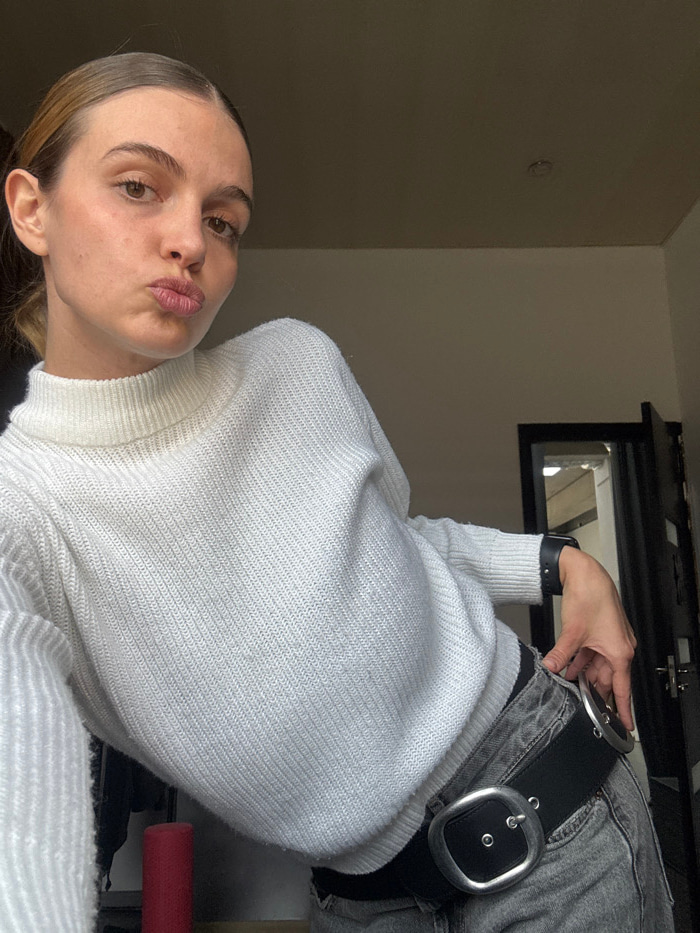 The scene is an indoor setting in Tbilisi, Georgia, illuminated by natural light from an unseen source to the right, creating a warm ambiance. A young adult female is centered in the frame, angled to…read more