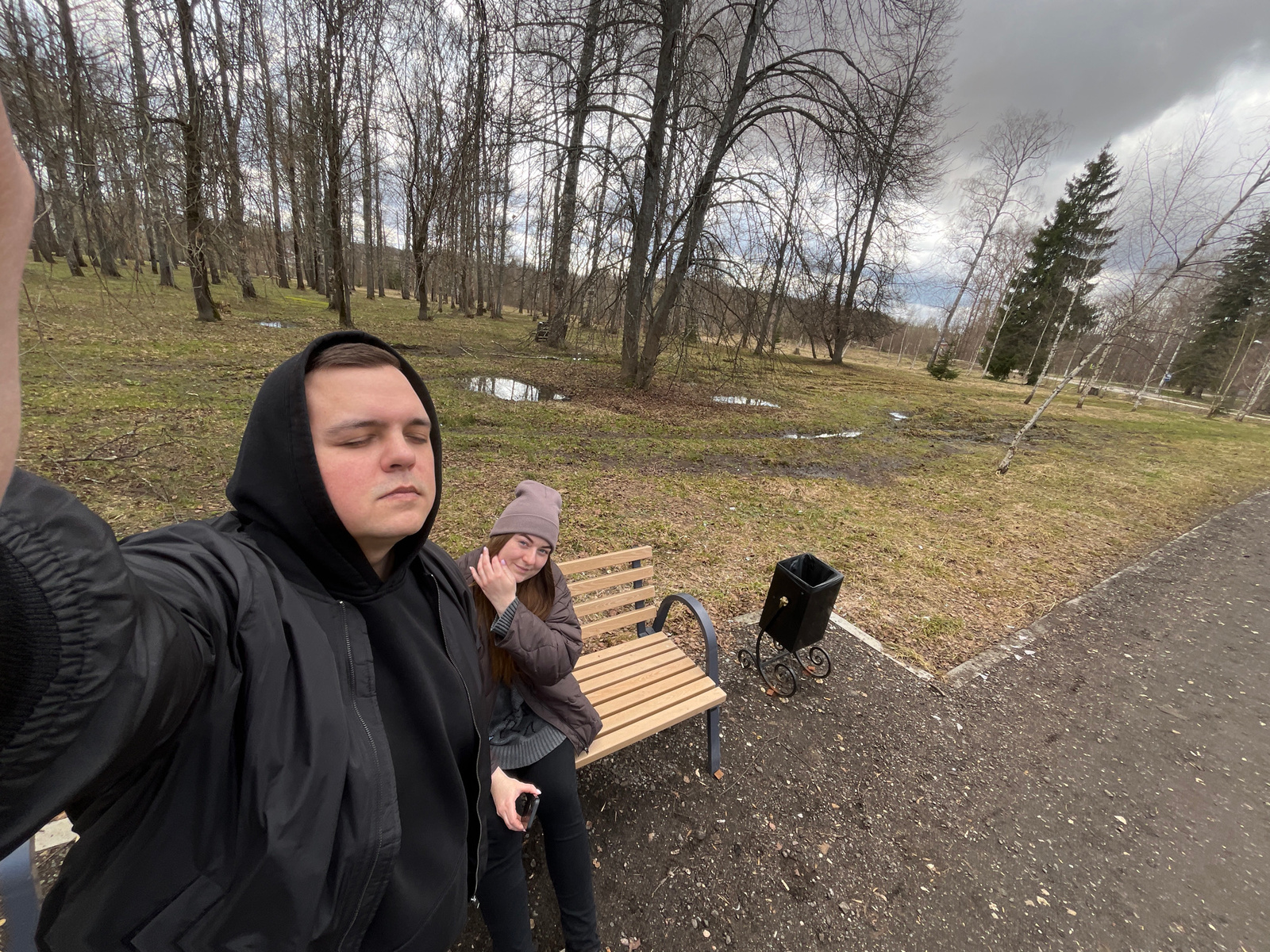 Two individuals are situated in a park-like environment in what appears to be the city of Vysokovsk, Russia. One person, wearing a black hooded jacket, is positioned in the foreground, seemingly holdi…read more
