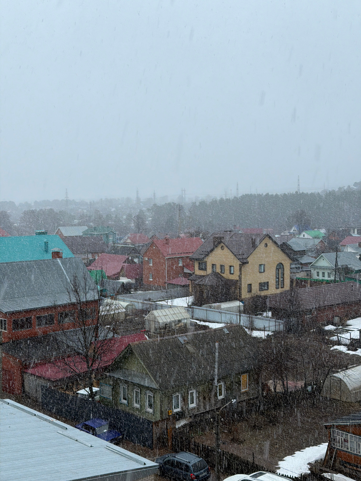The image depicts a snowy cityscape, possibly Chaikovsky, Russia. The view is elevated, overlooking a neighborhood with a mix of residential buildings. Houses with brightly colored roofs of red, green…read more