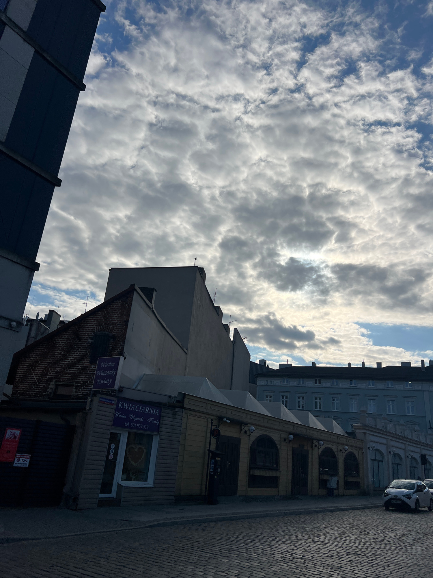 This is an outdoor, street-level shot in Bydgoszcz, Poland. The angle is slightly upwards, capturing buildings and the sky. The sky is filled with white and gray clouds, obscuring the sun which shine…read more