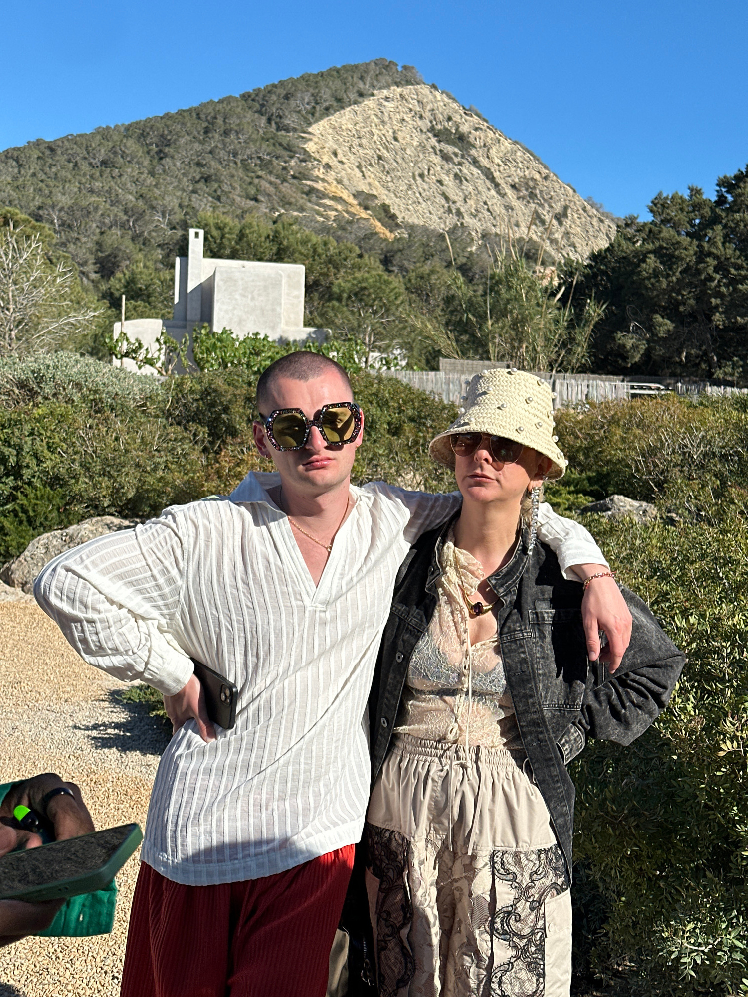 Two fair-skinned individuals pose outdoors in Sant Josep de sa Talaia, Spain. The person in the foreground wears a white, vertically-striped long-sleeved shirt, reddish-brown pants, and ornate sunglas…read more