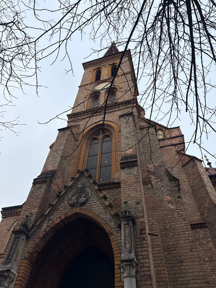 The image displays a low-angle exterior view of the Church of St. Blaise (Crkva sv. Blaža) in the City of Zagreb, Croatia. The primary subject is the church's main facade and prominent central bell to…read more