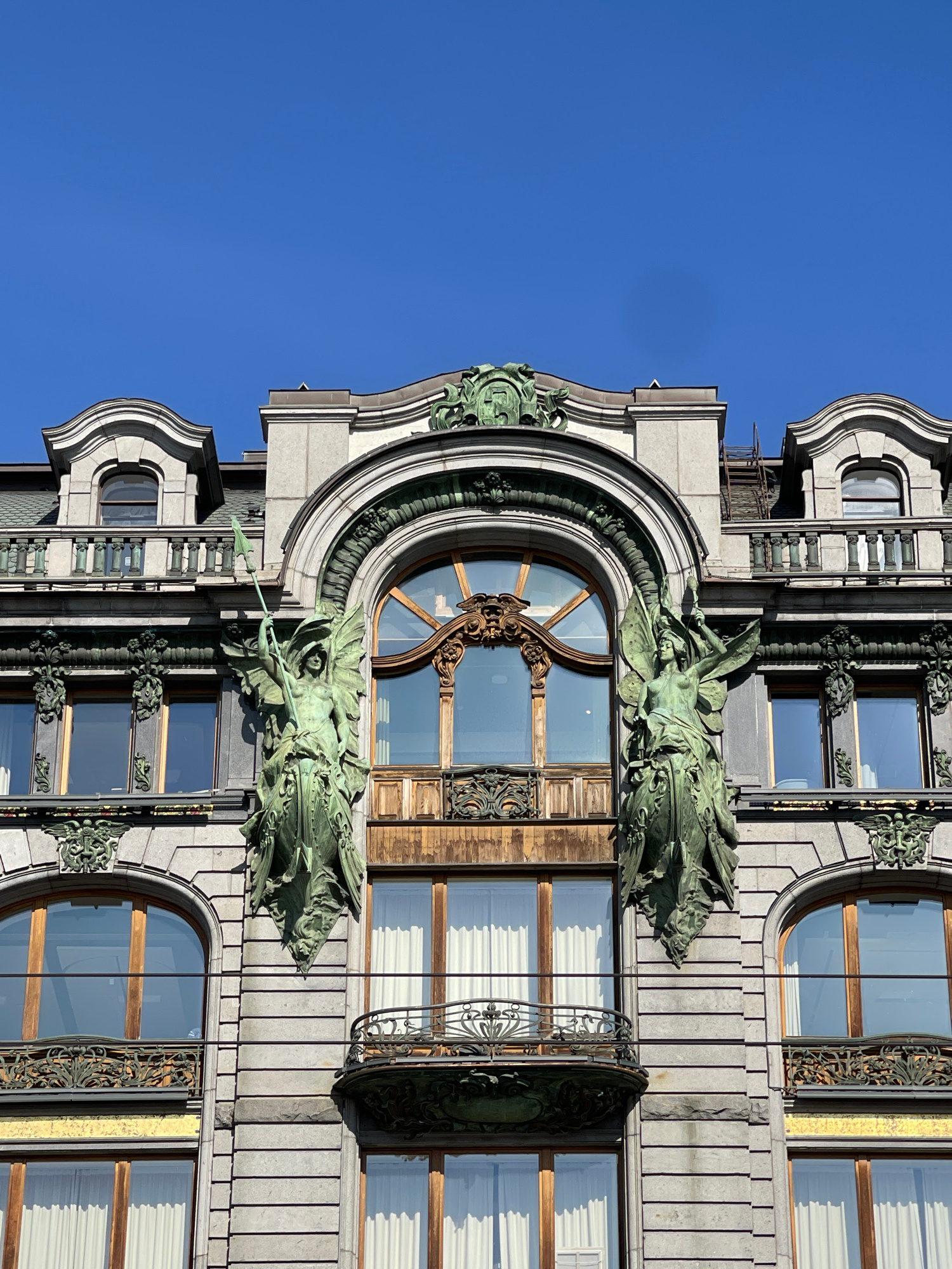 The image depicts a section of the Singer House (Dom Zinger), an Art Nouveau building located on Nevsky Prospekt in Saint Petersburg, Russia. The facade is adorned with architectural elements, includi…read more