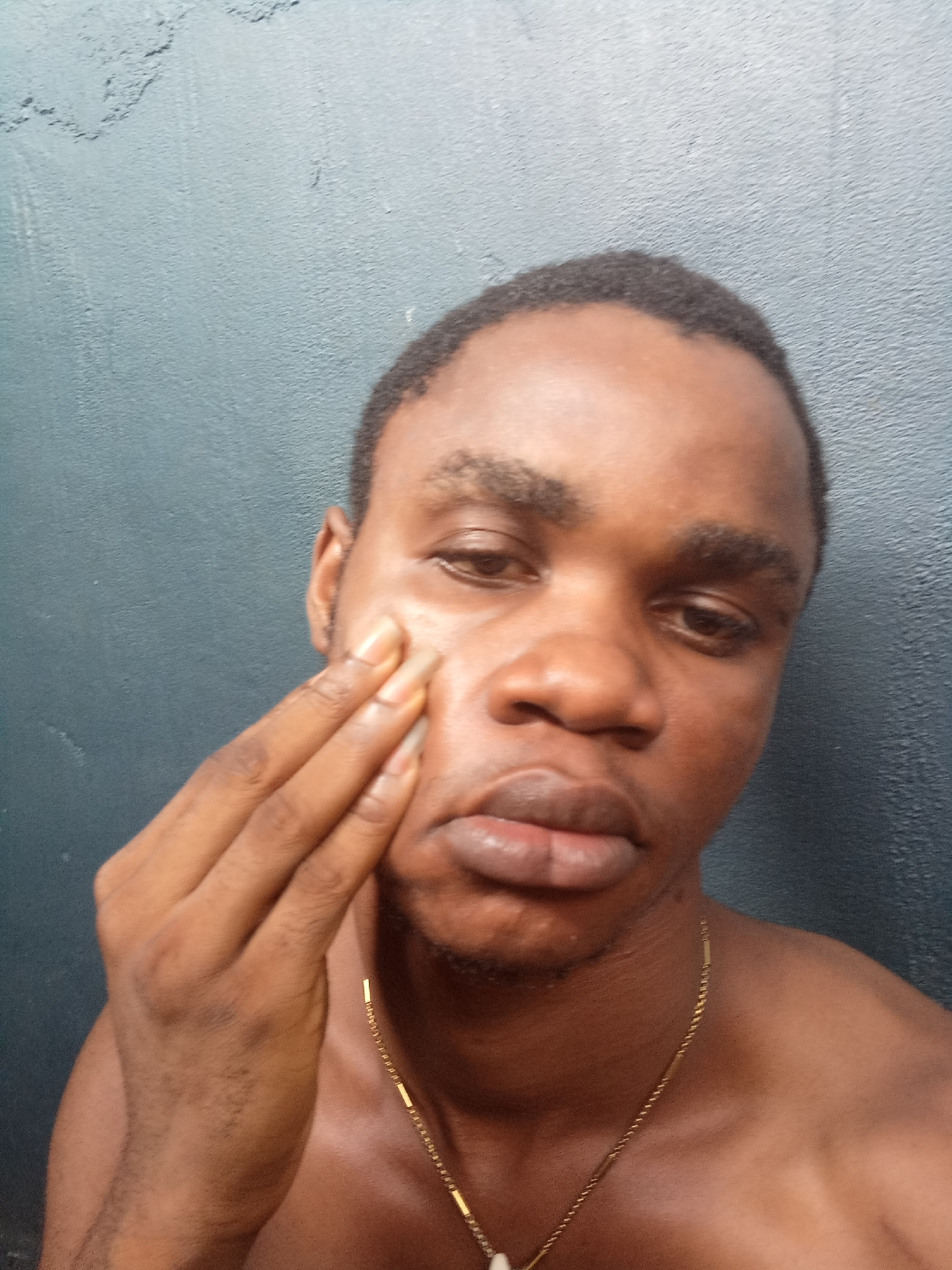 A man with dark skin and short, dark hair is shown from the chest up. He wears a gold chain around his neck. His right hand is touching his face, specifically his cheek. The background is a textured b…read more