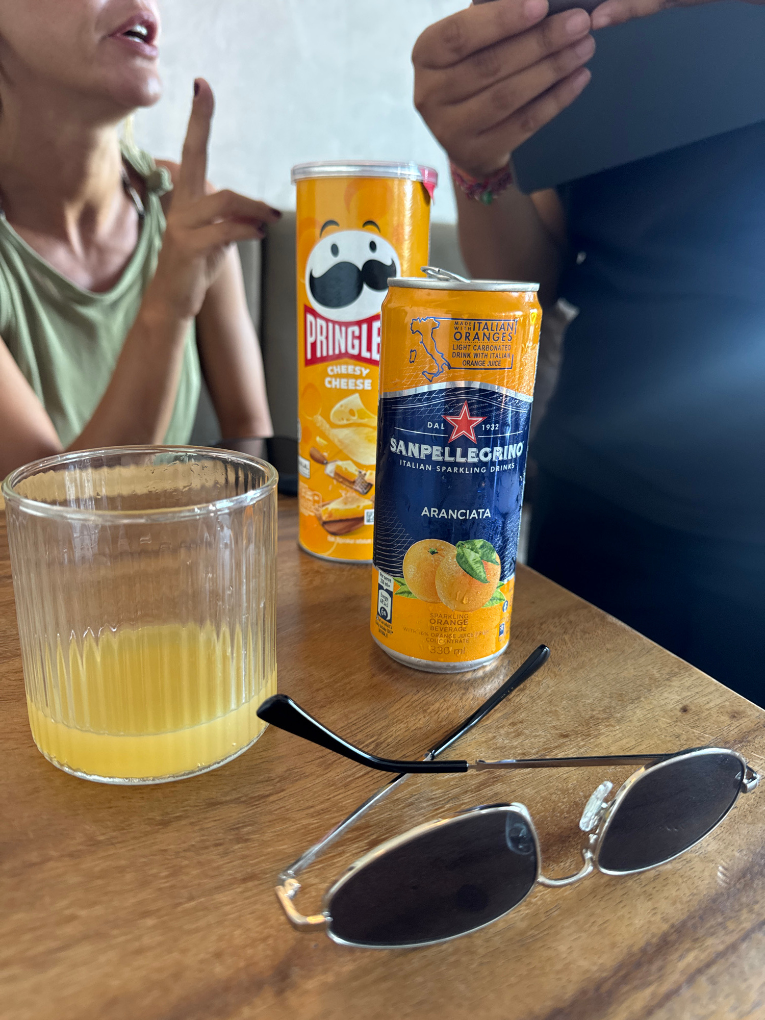 A table setting features a can of Pringles Cheesy Cheese, a can of San Pellegrino Aranciata (Italian Sparkling Orange Drink), a ribbed glass filled with a yellow liquid, and a pair of sunglasses. Two…read more