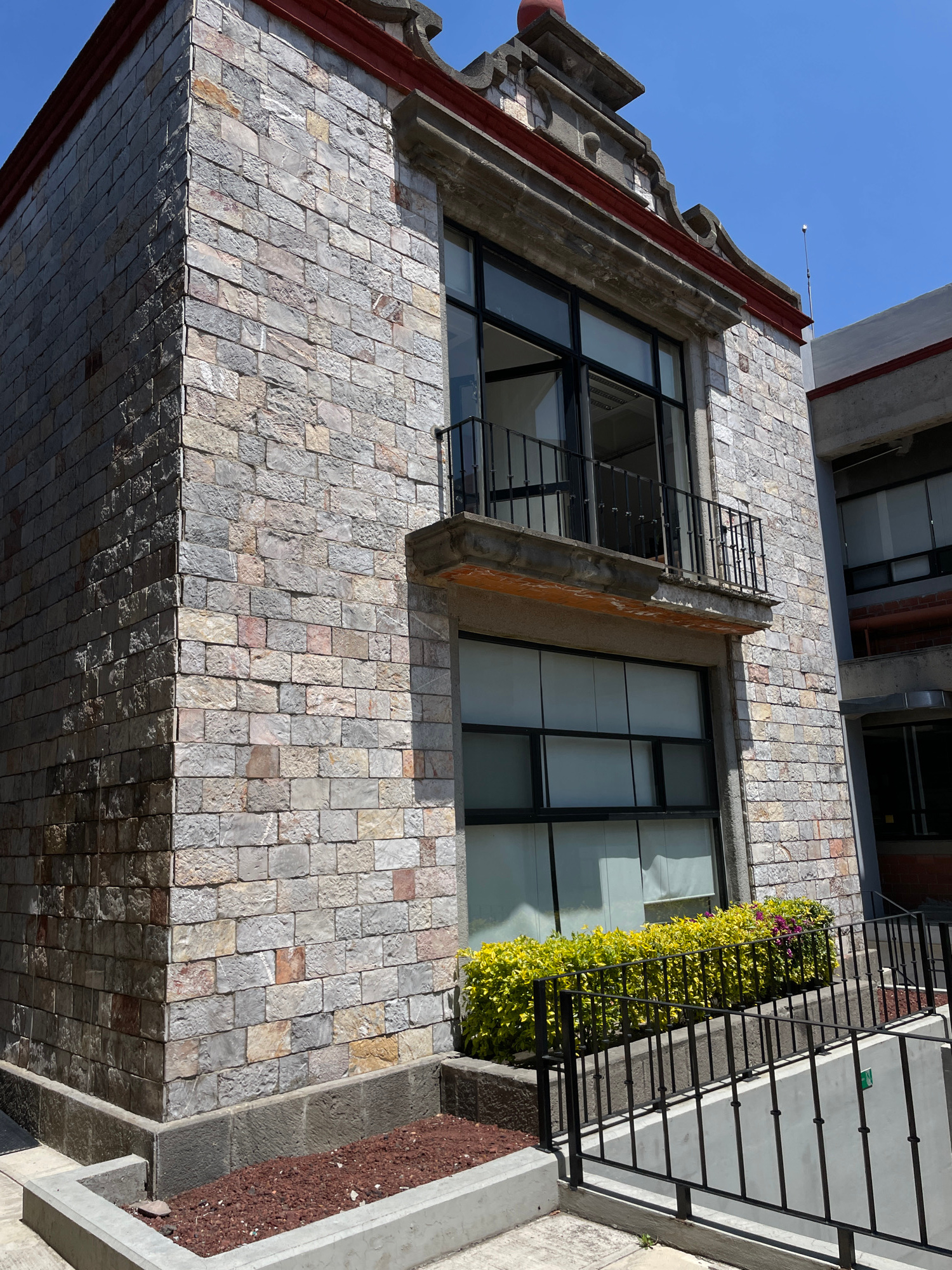 The image shows the exterior of a building in San Andrés Cholula, Mexico. The facade is constructed of rectangular, light-colored stone bricks, arranged in horizontal rows. Large windows with black fr…read more