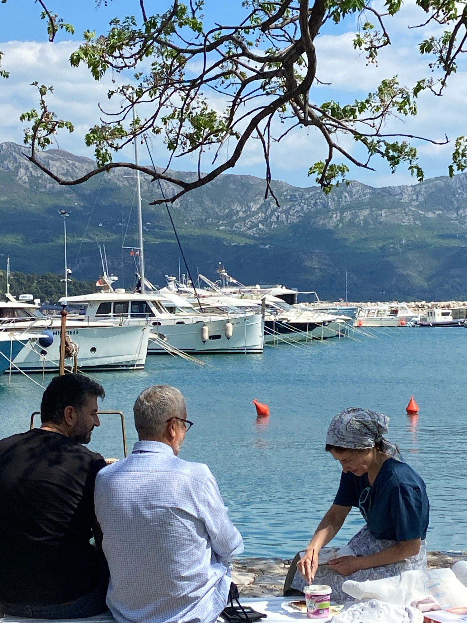 Two men stand beside a seated woman painting on a dock in Budva, Montenegro. Behind them, yachts are moored in the harbor. Mountains rise in the background under a partly cloudy sky, partially obscur…read more