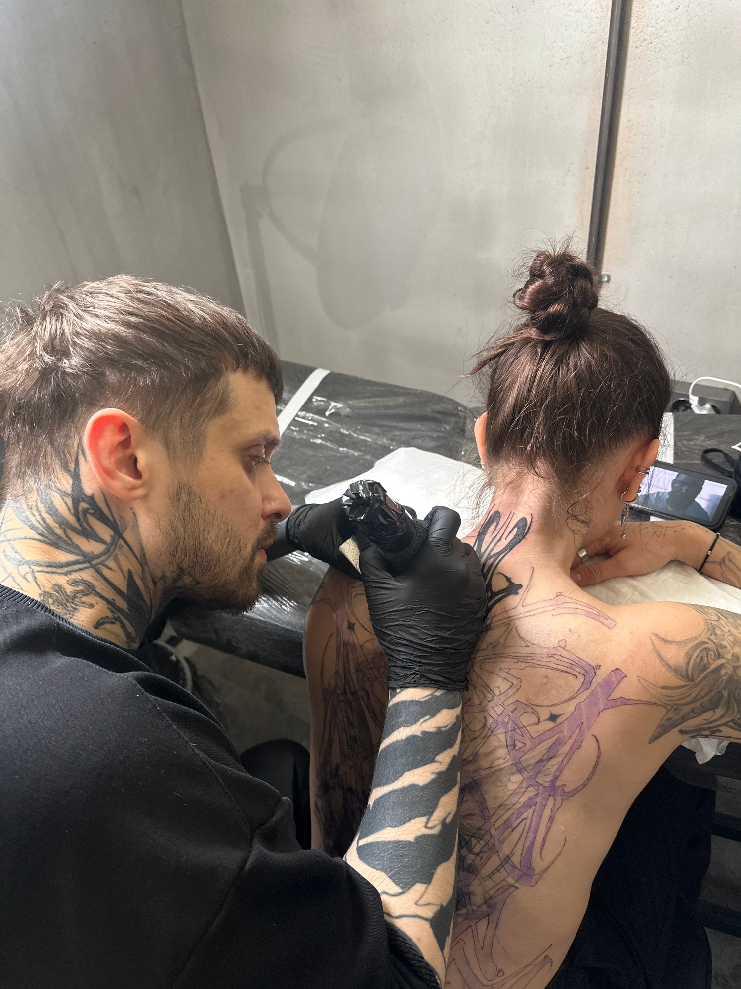 A man with a beard and neck tattoos is tattooing the back of a woman lying on a table. The man is wearing black gloves and using a tattoo machine. The woman has a bun and is lying face down with a pho…read more