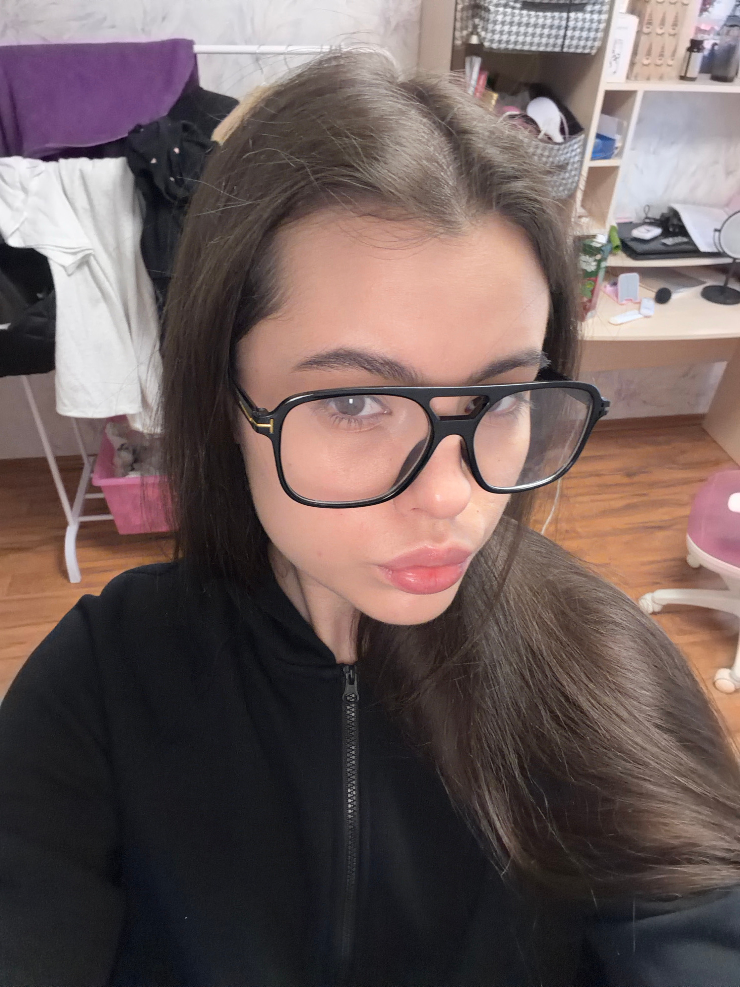 The image is a selfie of a young woman with long, dark hair and light eyes. She is wearing black-framed glasses and a black jacket. The background shows a room with a shelf containing various items, i…read more