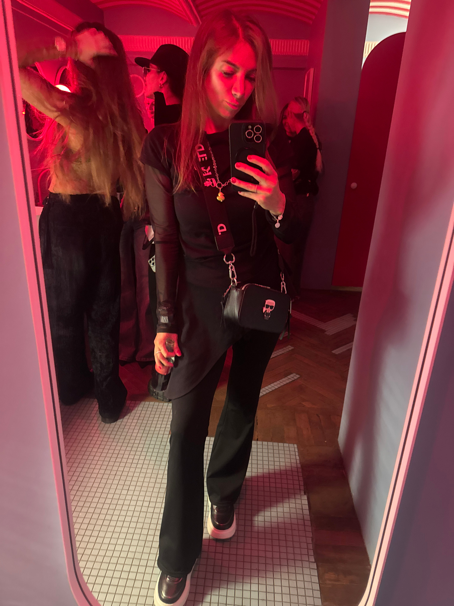 A photograph shows two people reflected in a mirror inside a room with a red light. One person has long, reddish-blonde hair and is wearing a black outfit, holding a black smartphone as if taking a se…read more