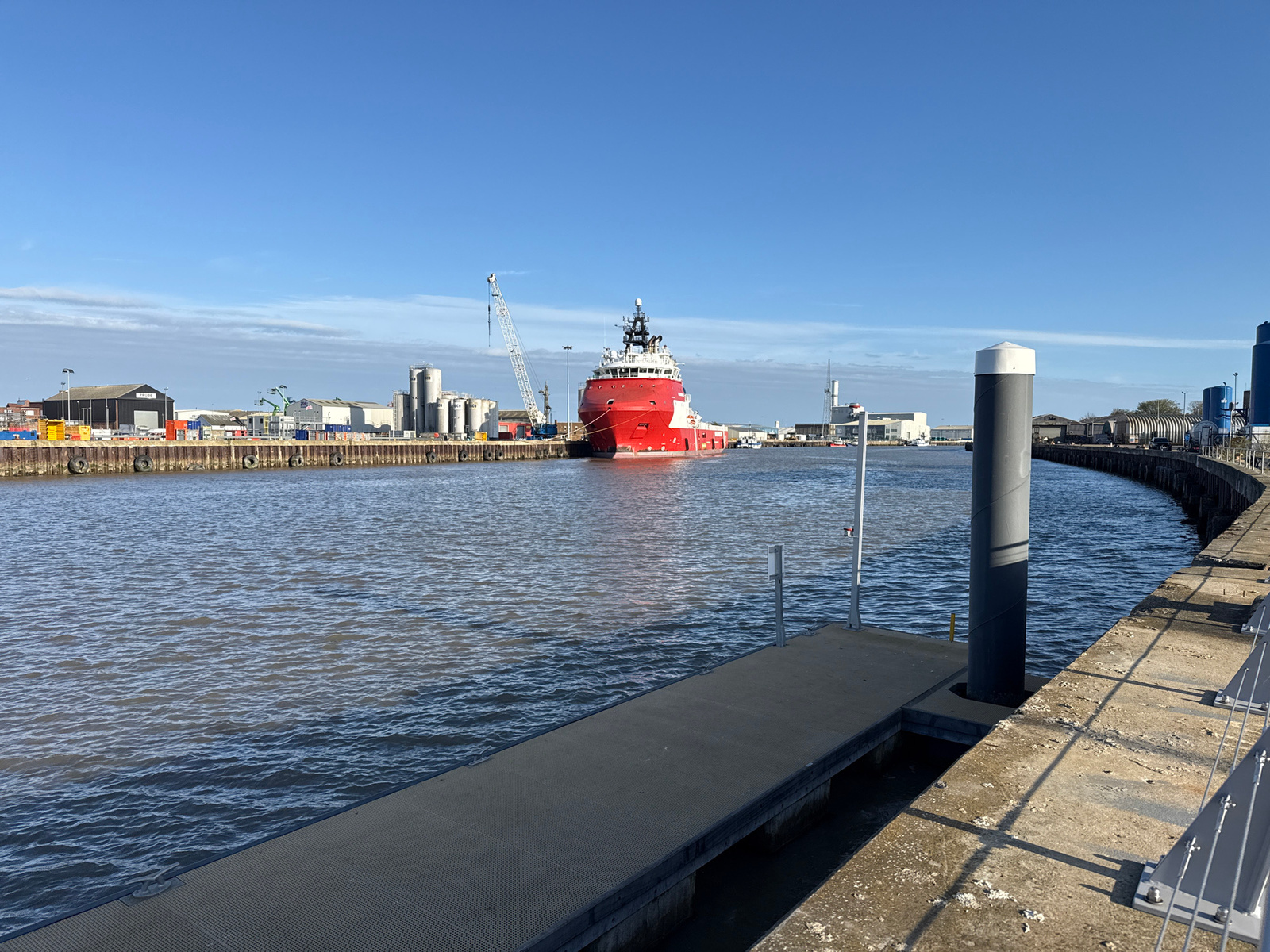 The image shows a waterway with a large red and white ship docked in the distance, likely a support vessel or similar maritime vessel. The location is identifiable as Gorleston-on-Sea, United Kingdom,…read more
