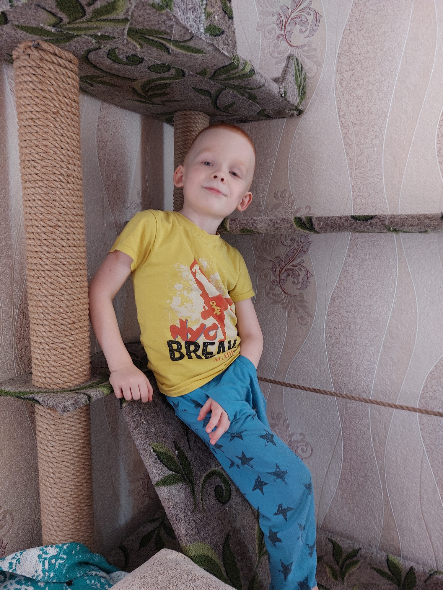 A child with red hair is lying on a multi-tiered structure. The child is wearing a yellow t-shirt with a print and blue pants with black stars. The structure has carpeted steps and posts wrapped in ro…read more