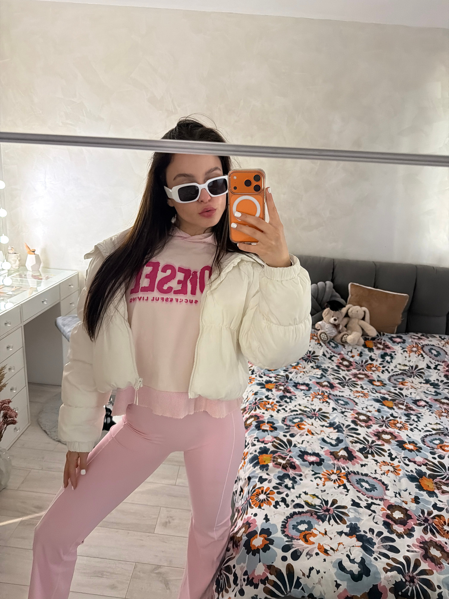 A woman is taking a mirror selfie indoors. She's wearing white sunglasses, a light pink hoodie with a red logo, a white puffer jacket, and light pink leggings. She's holding an orange phone with a whi…read more