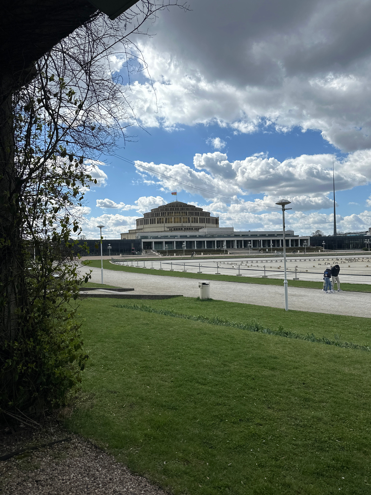 The image, taken at an oblique angle, presents a landscape with a prominent architectural structure in Wrocław, Poland, under a sky filled with cumulus clouds. The sky occupies a large portion of the scene, displaying a mix of blue patches and dense cloud formations. In the midground, a large, multi-story building with a distinctive dome-like roof, identifiable as the Centennial Hall (Hala Stulecia), stands adjacent to a paved pathway and a grassy area. Streetlights line the path. Fencing runs parallel to the building. Two figures are visible in the distance on the path. The foreground shows a patch of foliage with exposed branches. The bottom of the image is shaded. The overall environment suggests an urban park setting, with open spaces adjacent to significant architectural landmarks. | Open Wire