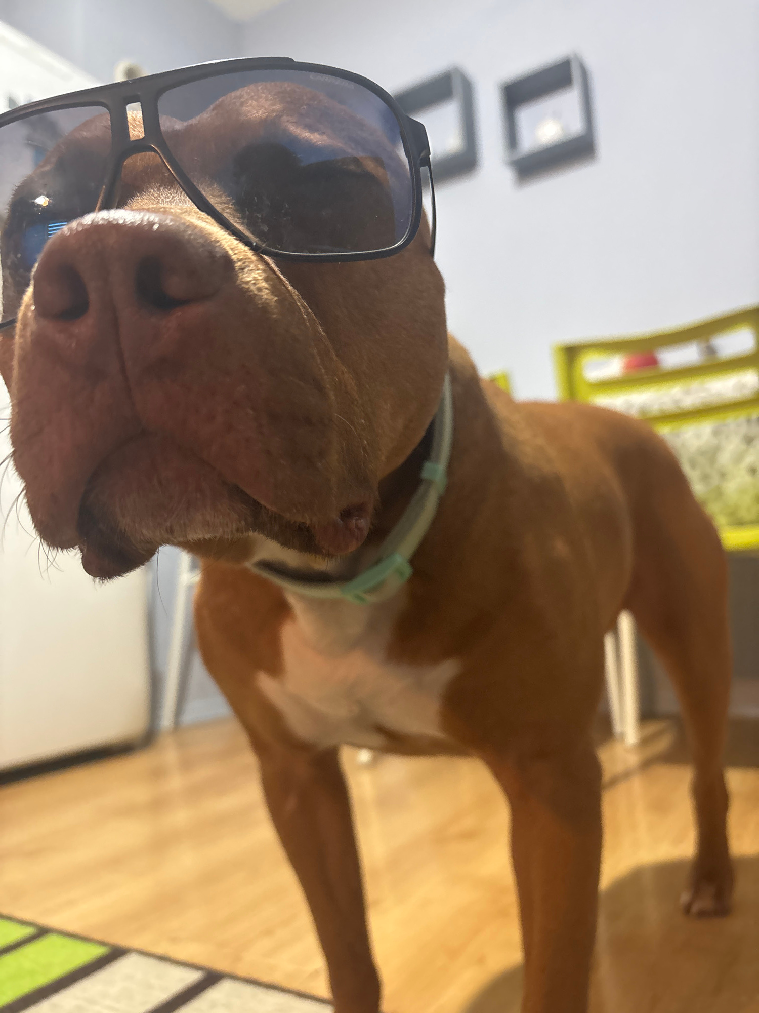 A medium-sized, brown dog is wearing sunglasses. The dog has a white chest and a light green collar. The dog is inside, possibly in a home or apartment. There are wall decorations and a wooden floor.…read more