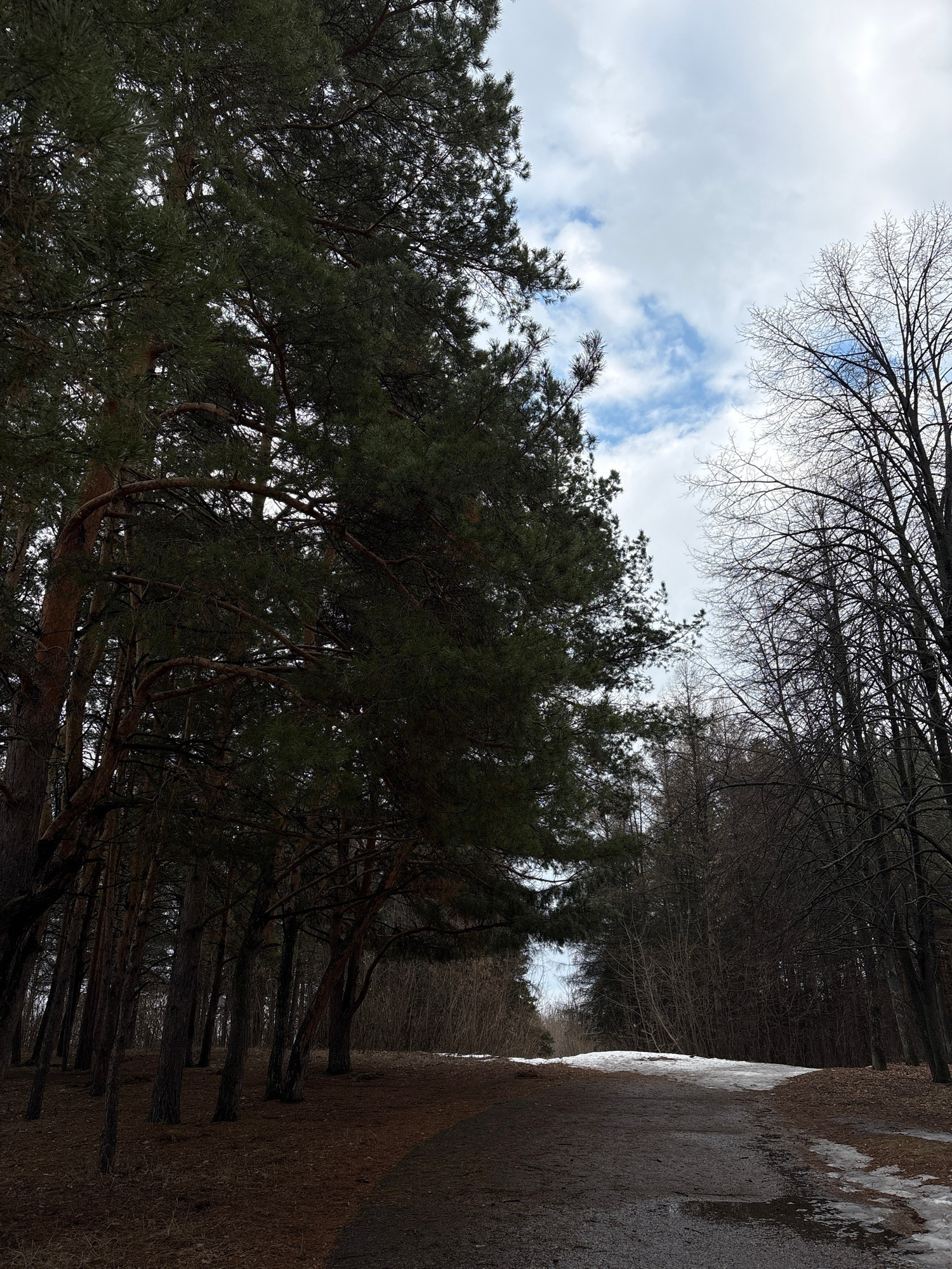 The image depicts a view of a forest in Ulyanovsk, Russia, with a cloudy sky visible through the trees. A path runs along the edge of the forest. Some of the trees have dense foliage, while others are…read more