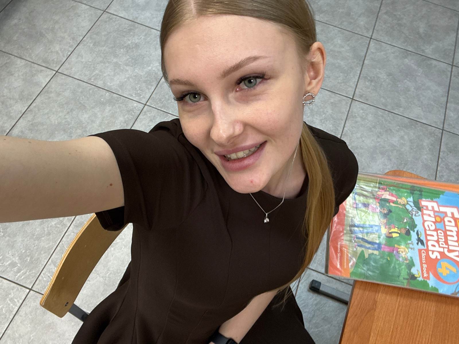 A vertically oriented close-up photograph shows a blonde woman seated, with her face angled towards the camera. She is wearing a dark brown dress and a silver necklace with a pendant. Her left ear has…read more