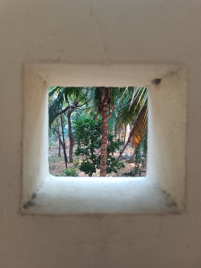 The image displays a framed view through a roughly square, off-white aperture in a thick, textured wall, located in Puttaparthi, India. Beyond the aperture, a natural wooded environment is visible und…read more