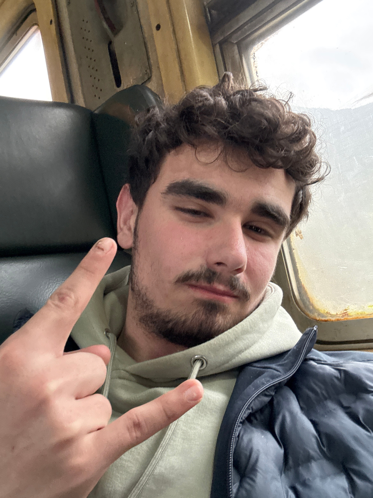 A young man with dark curly hair and a beard is in a vehicle, possibly a bus or train, indicated by the seat and overhead window. He is wearing a light green hoodie and a dark puffer jacket. He is giv…read more