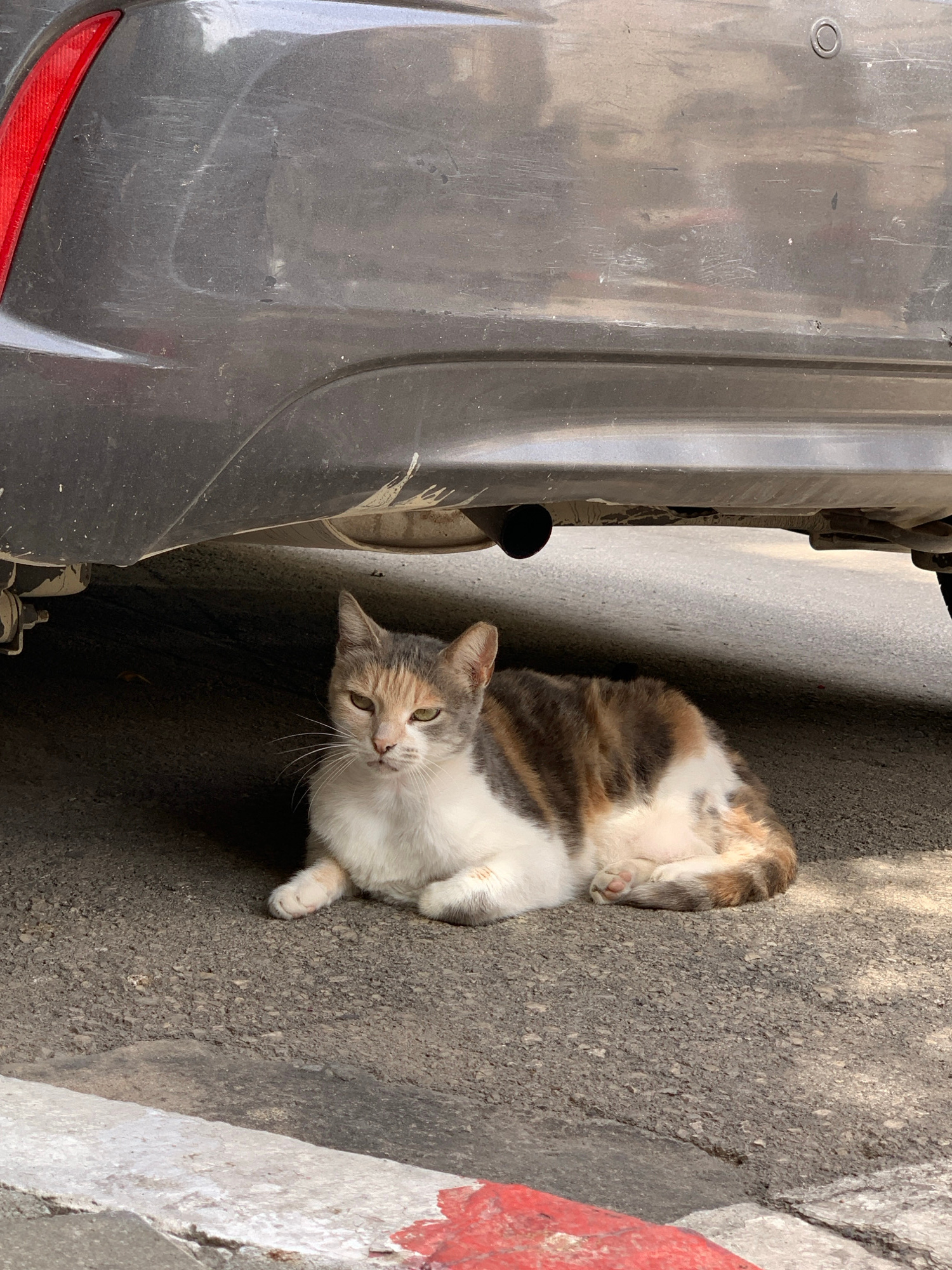 A medium shot reveals a cat lying on its back on the pavement between a gray car and a curb. The pavement is gray asphalt with some shadows cast on it. The cat has white, gray, and orange fur. It is p…read more