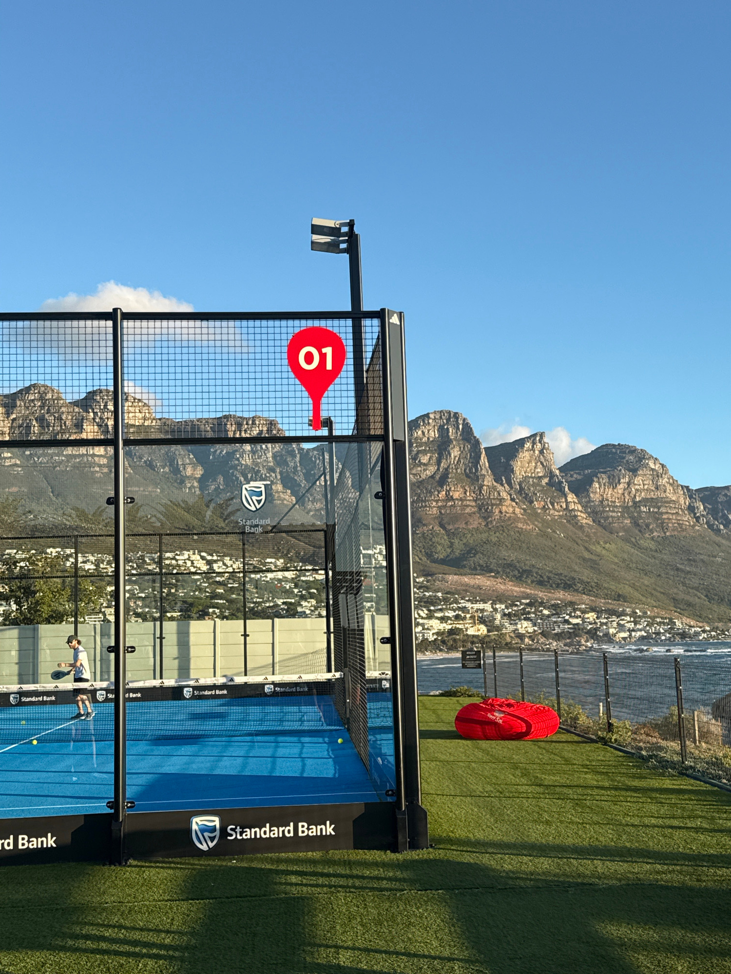 The image shows a padel tennis court located in Cape Town, South Africa. The court is situated outdoors, with a view of the city's iconic mountain range, the Twelve Apostles. The court has blue floori…read more