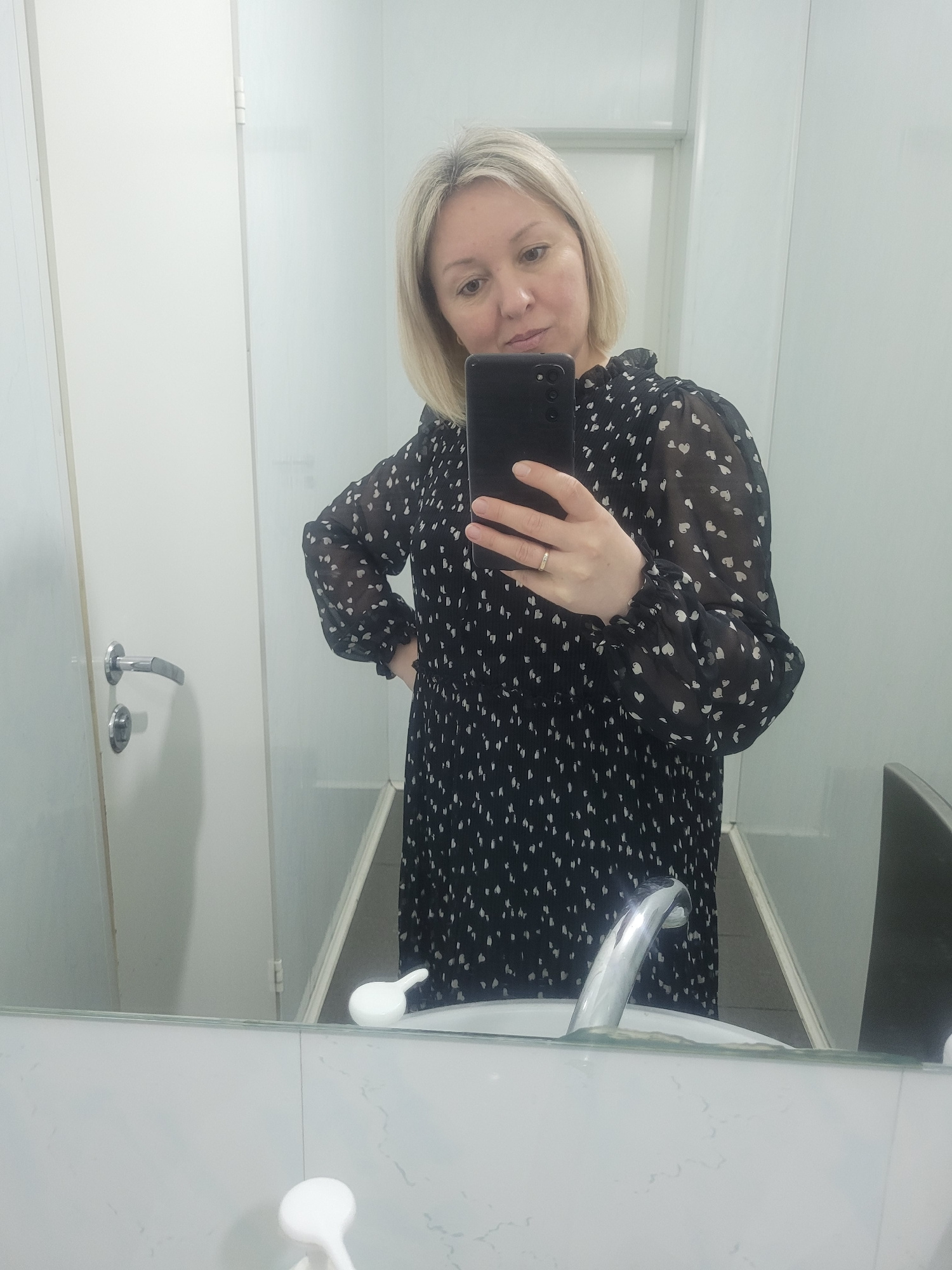 The image shows a person taking a selfie in a bathroom. The person is a woman with blonde hair wearing a black dress with white heart patterns. She is holding a black smartphone, partially obscuring hโ€ฆread more