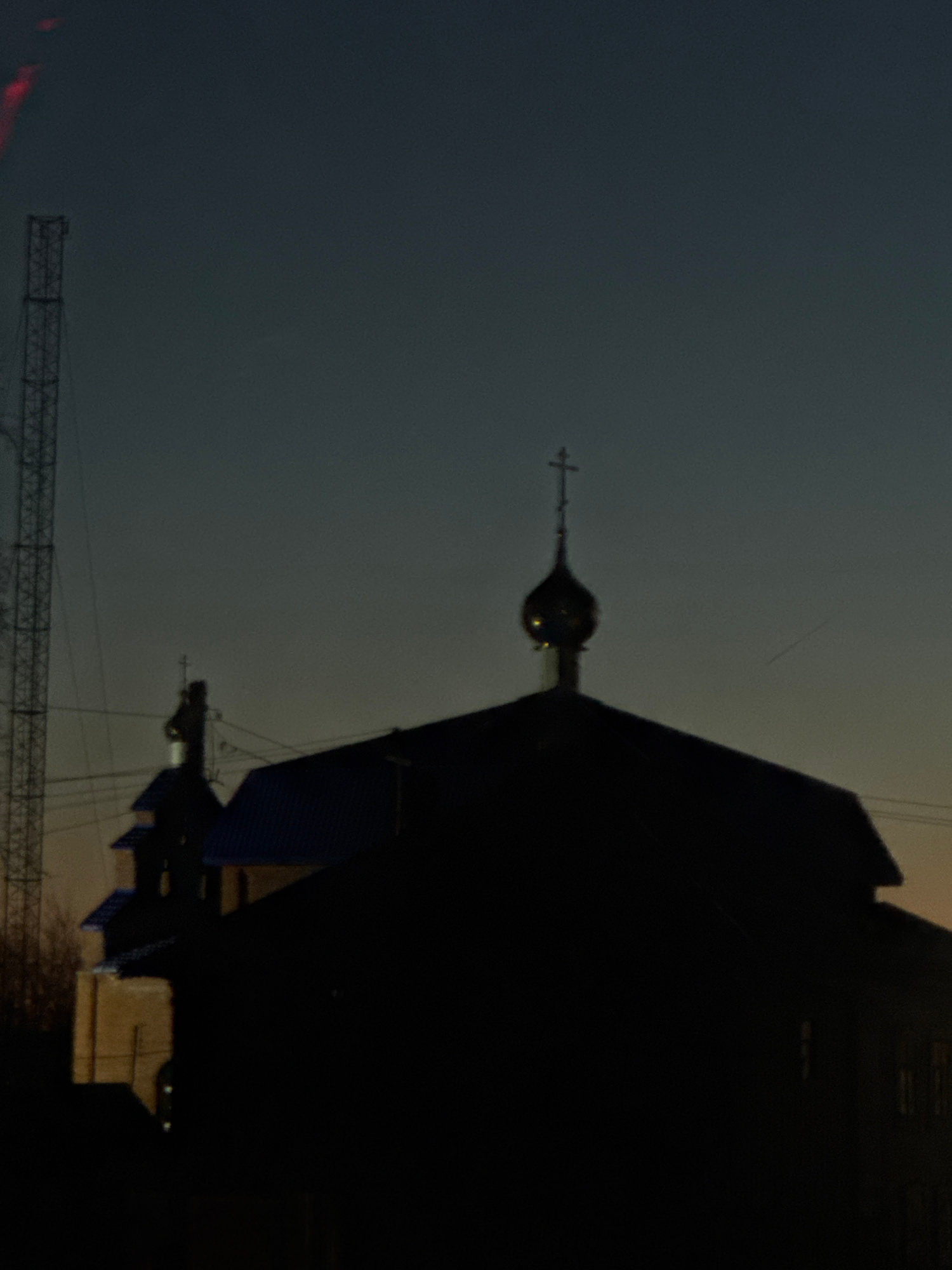 The image, rotated 90 degrees counterclockwise, depicts a dark urban scene in Фоки, Russia, dominated by a silhouette of a building with a prominent Orthodox-style dome and cross. A large construction…read more