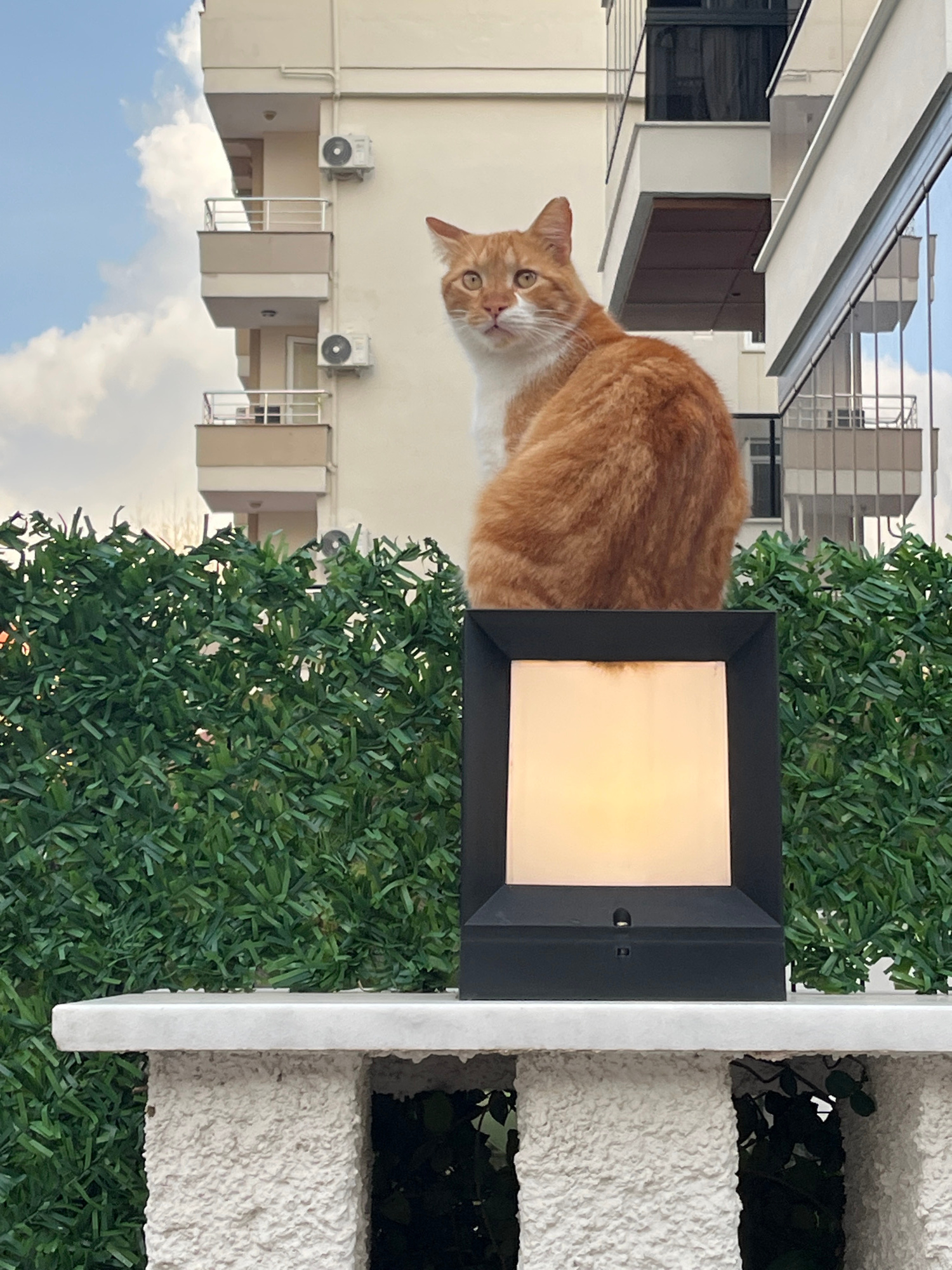 The scene depicts an outdoor urban environment in Alanya, Turkey. A domestic cat, predominantly orange (ginger) with white markings on its chest and muzzle, is seated upright in the upper-middle of th…read more