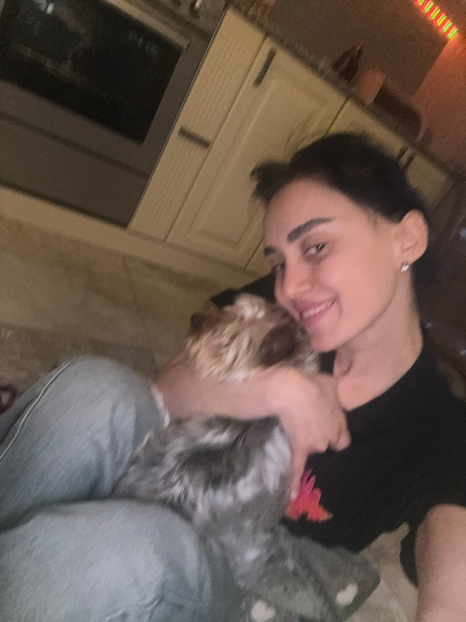 A woman is pictured indoors, cradling a small dog. She has dark hair pulled back, fair skin, and is wearing a dark top and light-colored jeans. The dog is light brown and gray. They appear to be in a…read more