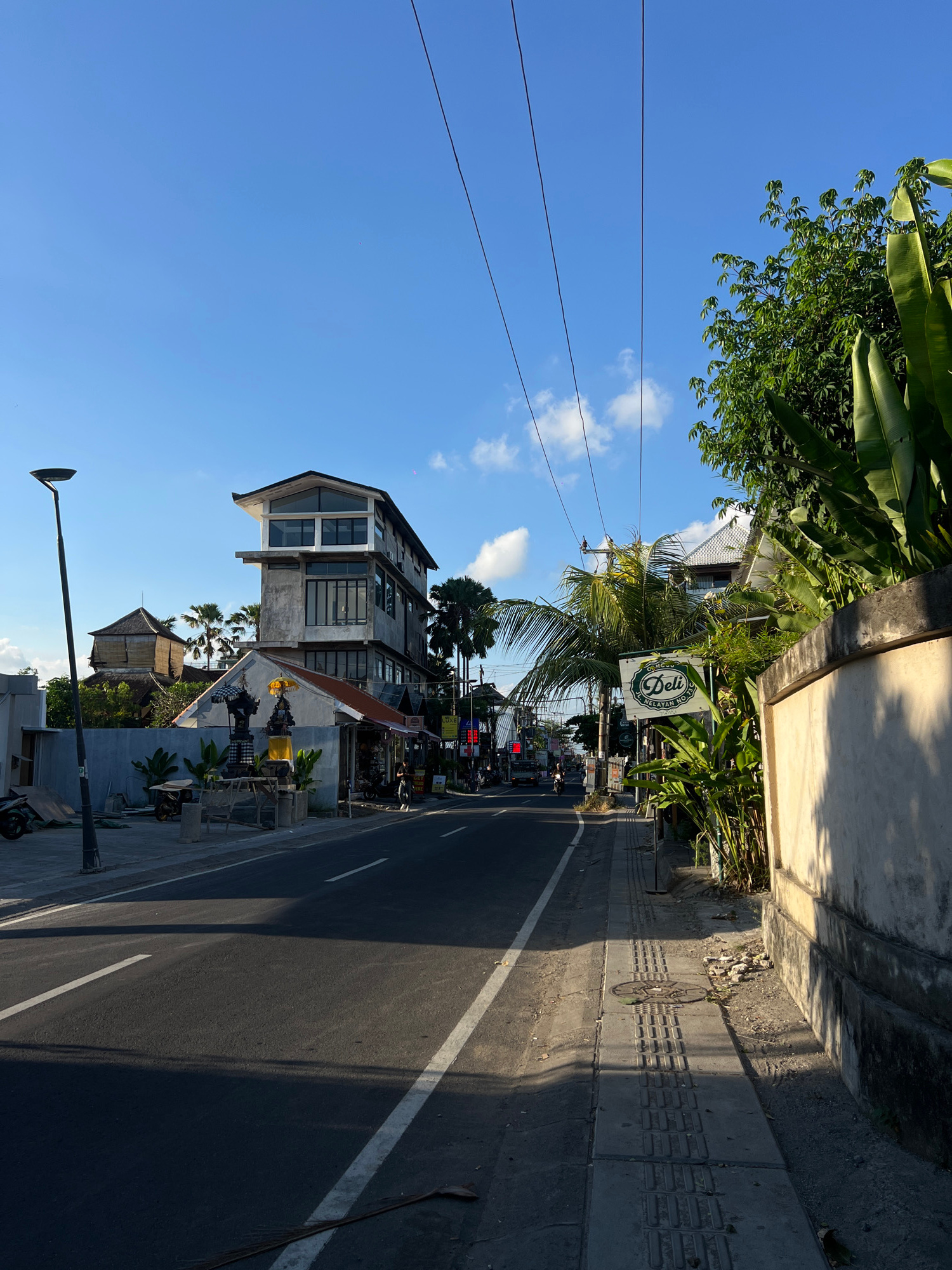 The image shows a street in North Kuta, Indonesia. The road is asphalt with a white line marking its edge. On the right, there is a concrete sidewalk. Buildings line the street, including a multi-storβ¦read more