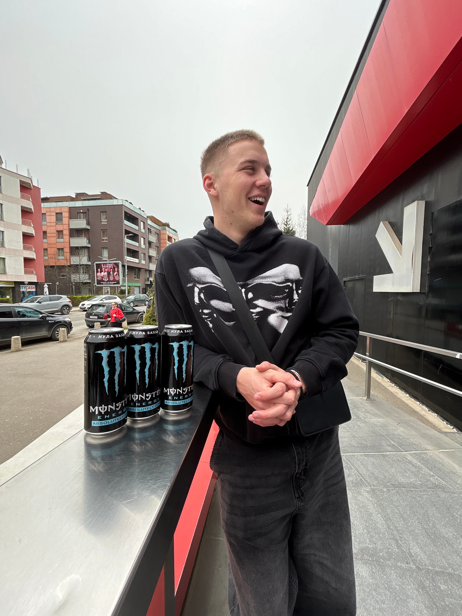 A photograph taken in Sofia, Bulgaria, depicts a fair-skinned young man with closely cropped hair and a black hooded sweatshirt with a graphic on it, wearing dark jeans and a black shoulder bag. He stβ¦read more