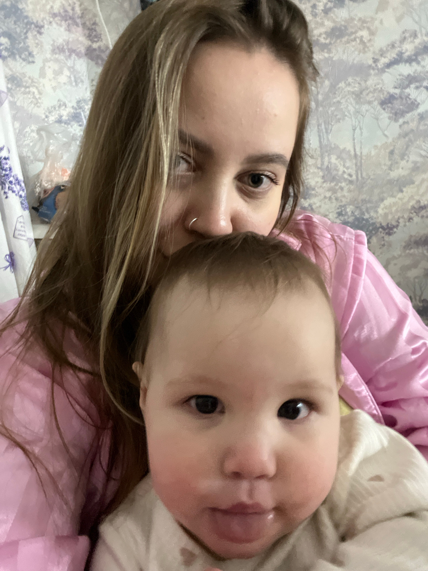 A woman and a baby are lying close together. The woman has long blonde hair and is wearing a pink top. The baby, dressed in white, is looking at the camera with its tongue slightly sticking out. The b…read more