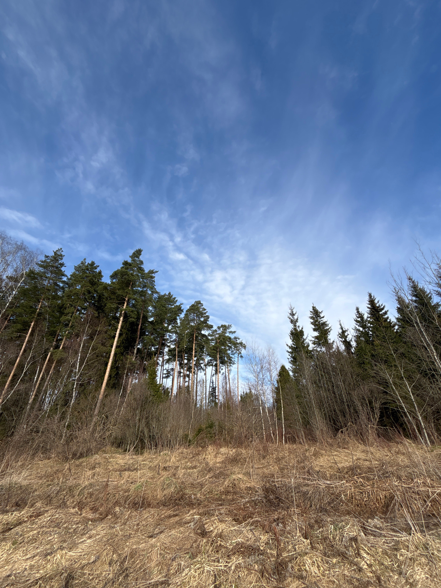 The image shows a scene with a blue sky partially covered with wispy clouds, alongside a forest edge transitioning into a field. The location is Раздолье, Russia. The forest consists of coniferous and…read more
