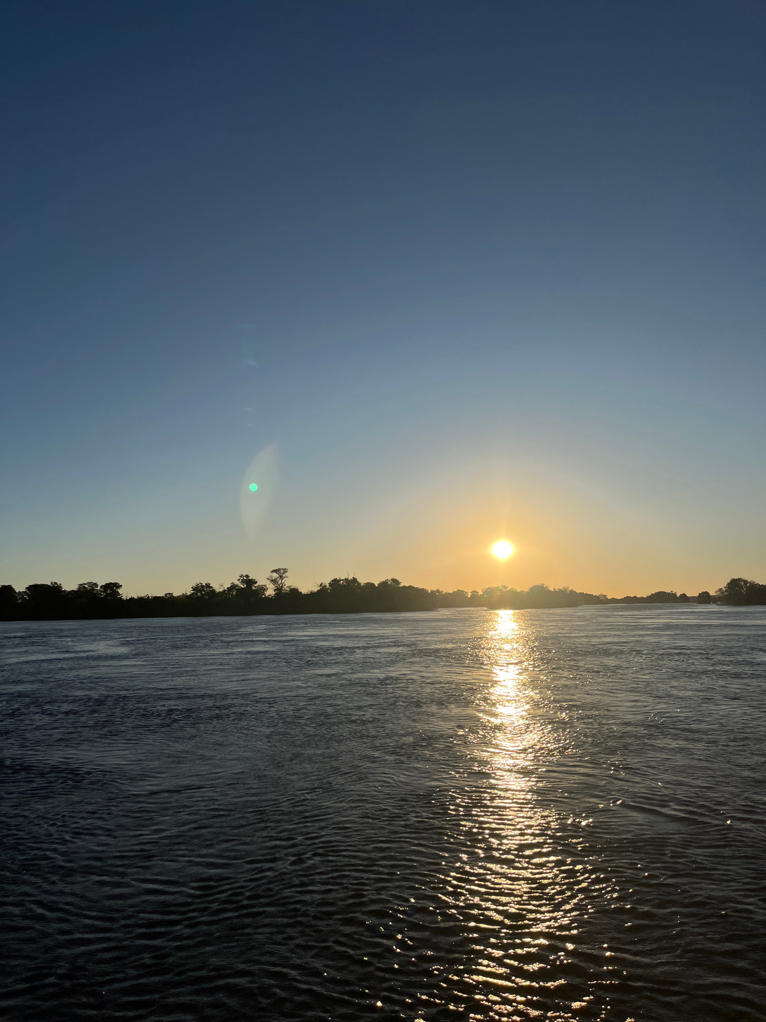The image shows a sunset over the Zambezi River in Victoria Falls, Zimbabwe. The sun is positioned in the center of the frame, casting a bright glare across the water. The sky is a clear blue, fading…read more