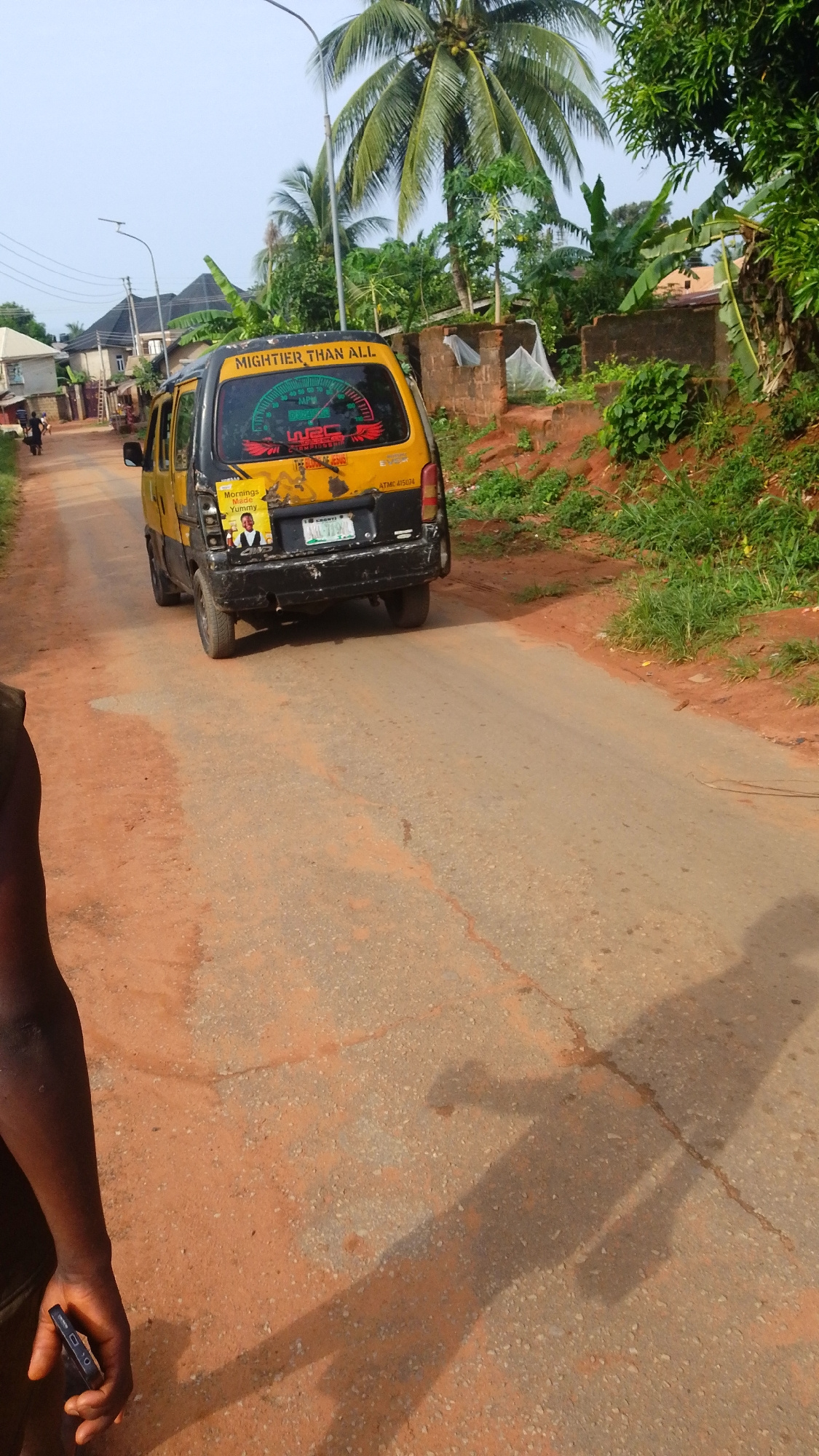 The image shows a yellow and black minivan with the text "MIGHTIER THAN ALL" on the back, driving on a partially paved road in Enugwu-Ukwu, Nigeria. The vehicle has a Nigerian license plate. The surroβ¦read more