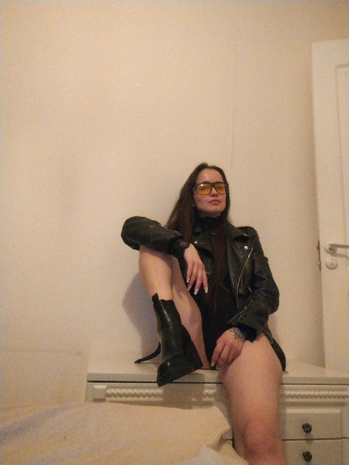 An image captured in Noviy, Russia, depicts a single female subject seated on a light-colored dresser or console table within an indoor residential setting. The subject has long, dark hair and wears yβ¦read more