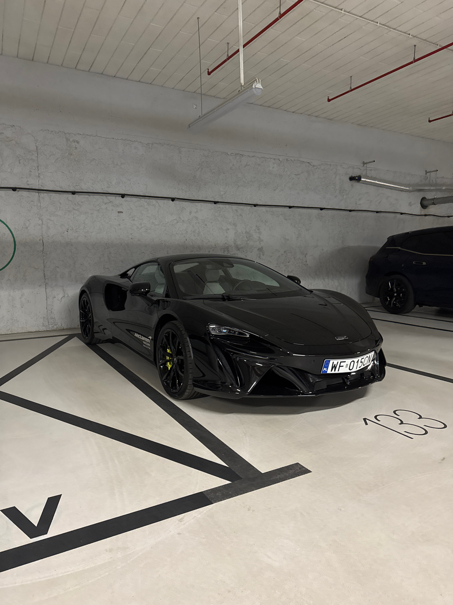 The image shows an indoor parking garage in Warsaw, Poland. A black McLaren sports car is parked in space 33. A second dark car is partially visible in the upper portion of the image. The McLaren has…read more