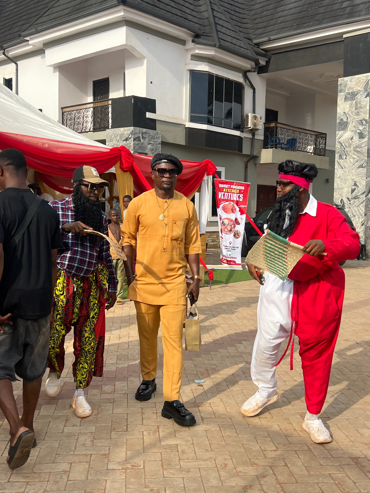 The image depicts a street scene in Onitsha, Nigeria. Two individuals in elaborate costumes stand outside a building adorned with red and white fabric. One person wears a red robe, white trousers and…read more