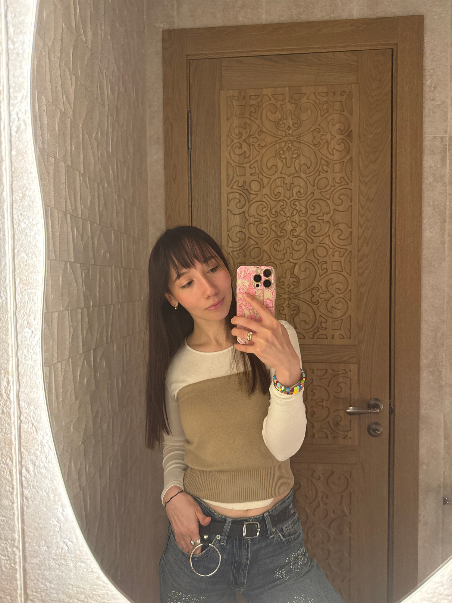 A young woman is taking a mirror selfie in a bathroom. The bathroom features a carved wooden door with a silver handle, and a wall with textured, light-colored tiles. The mirror is circular and has a…read more