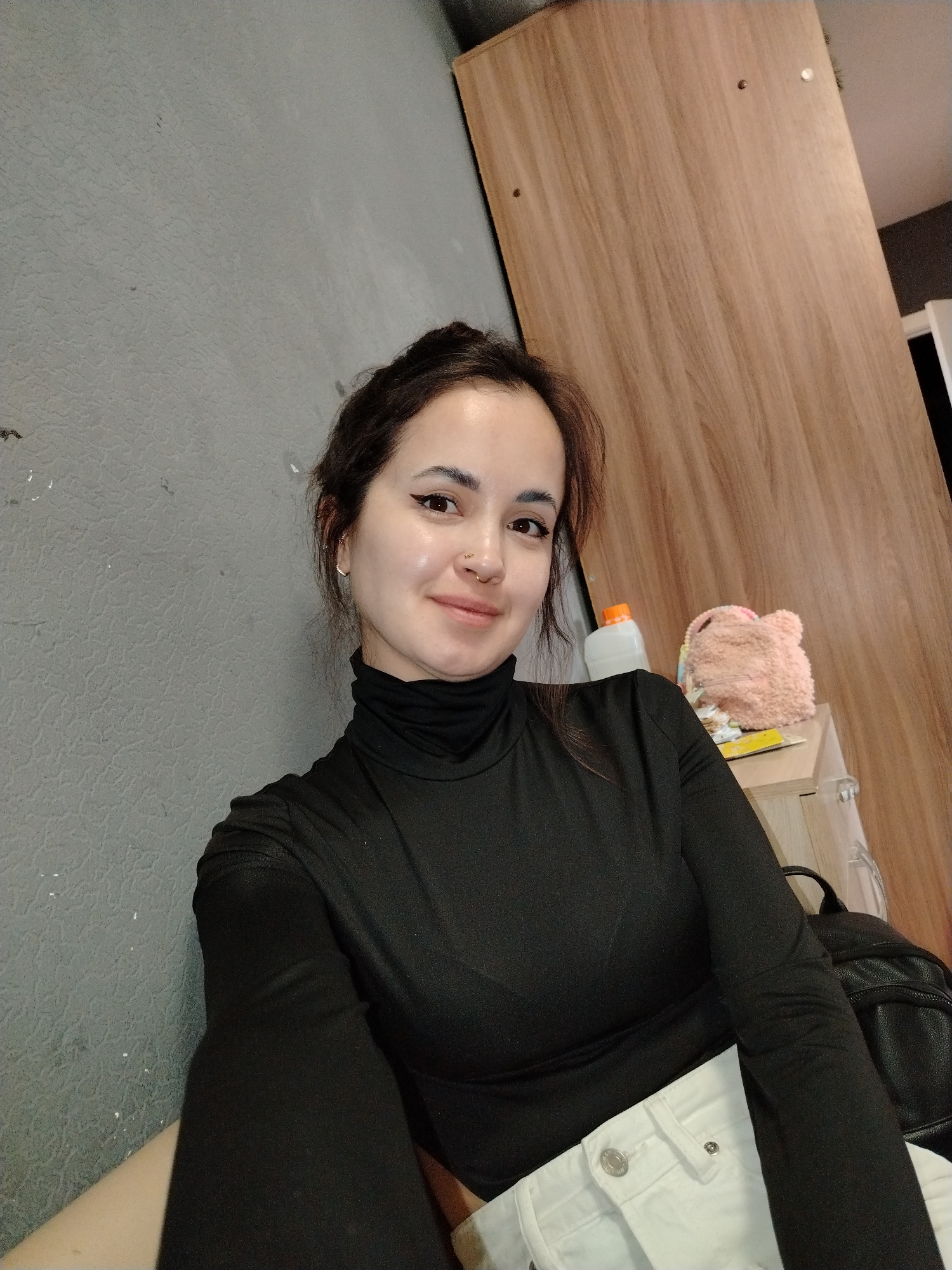 A woman is shown in a medium close-up shot. She has dark hair and is wearing a black turtleneck shirt and white pants. She is smiling slightly. Behind her is a gray wall on the left, and a wooden cabiβ¦read more