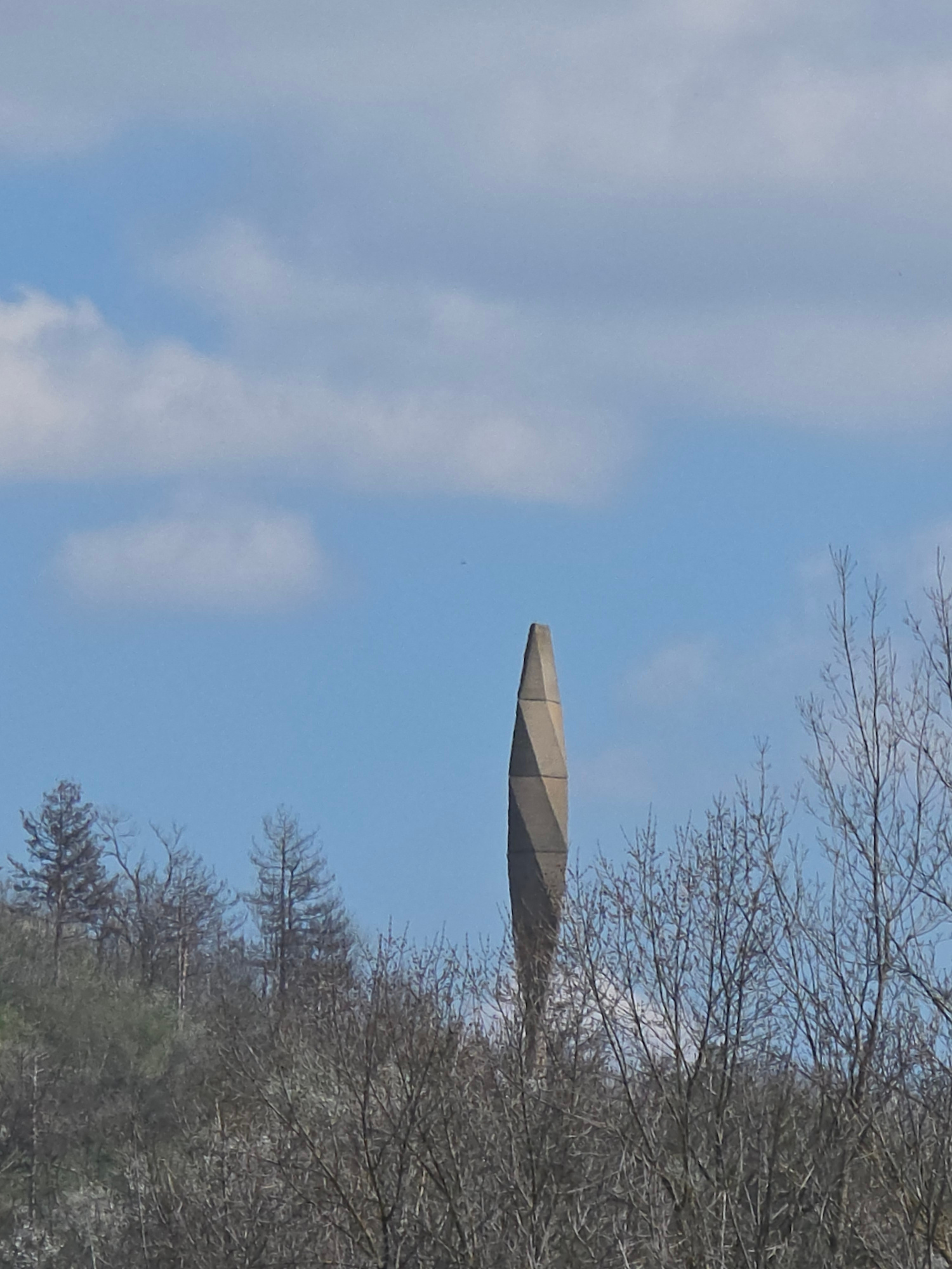 The image shows a monument against a blue sky with light clouds. The monument is an elevated, horizontal structure with a tapered, angular design. Leafless trees are visible to the right of the monume…read more