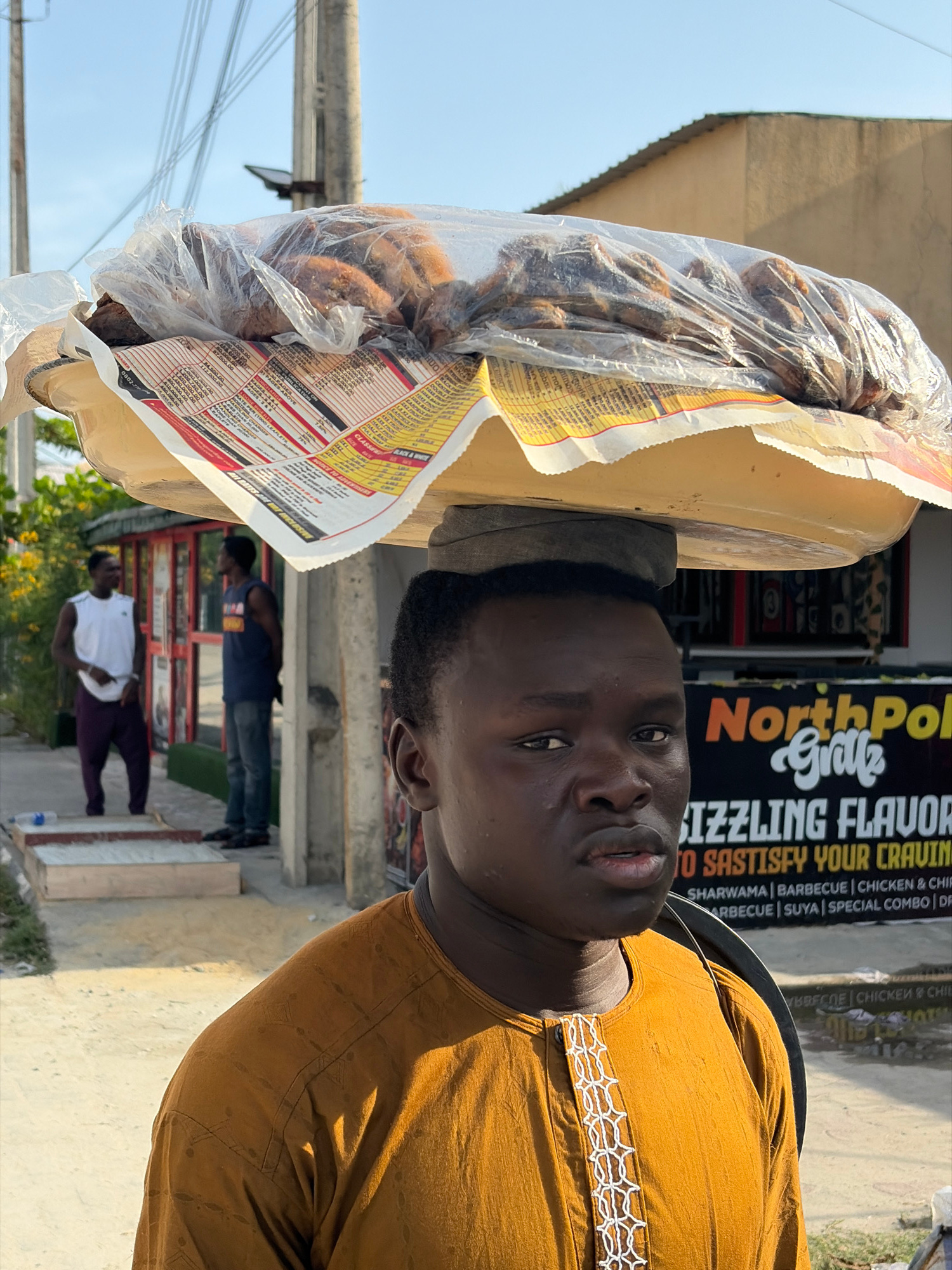A street vendor in Igboefon, Nigeria, balances a tray on his head containing wrapped snacks, likely suya. The snacks are packaged in plastic and wrapped in newspaper advertising rates. The vendor wear…read more
