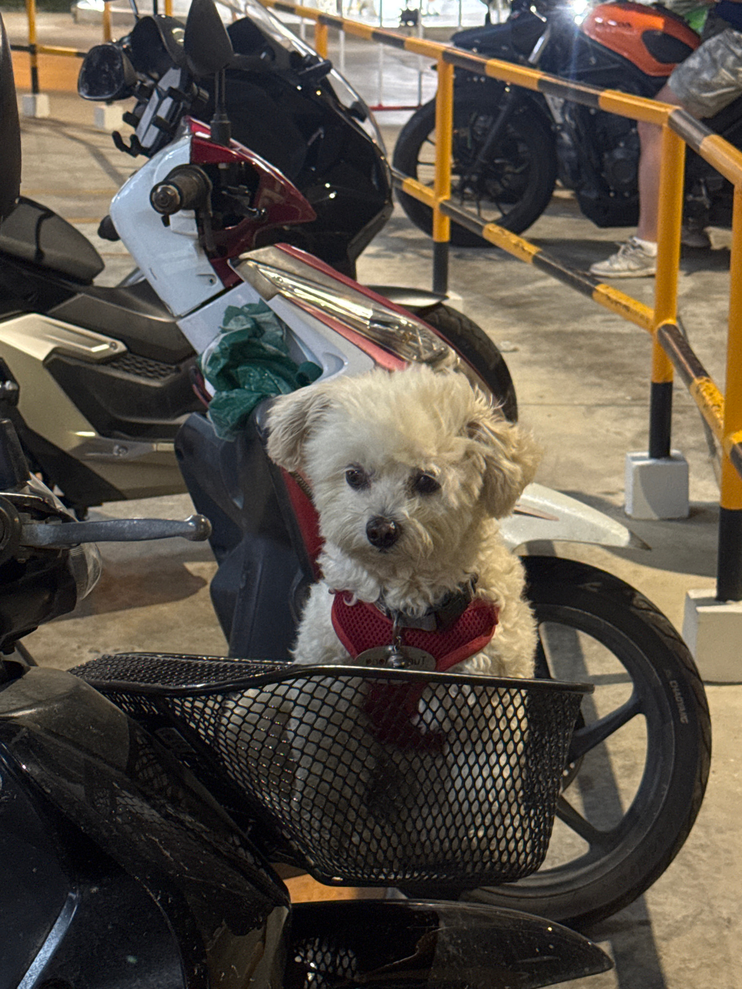 A small, light-colored, fluffy dog with a red harness is perched on the front of a motorcycle in a parking garage. The motorcycle is white, black, and red. A black wire basket is attached to the front…read more