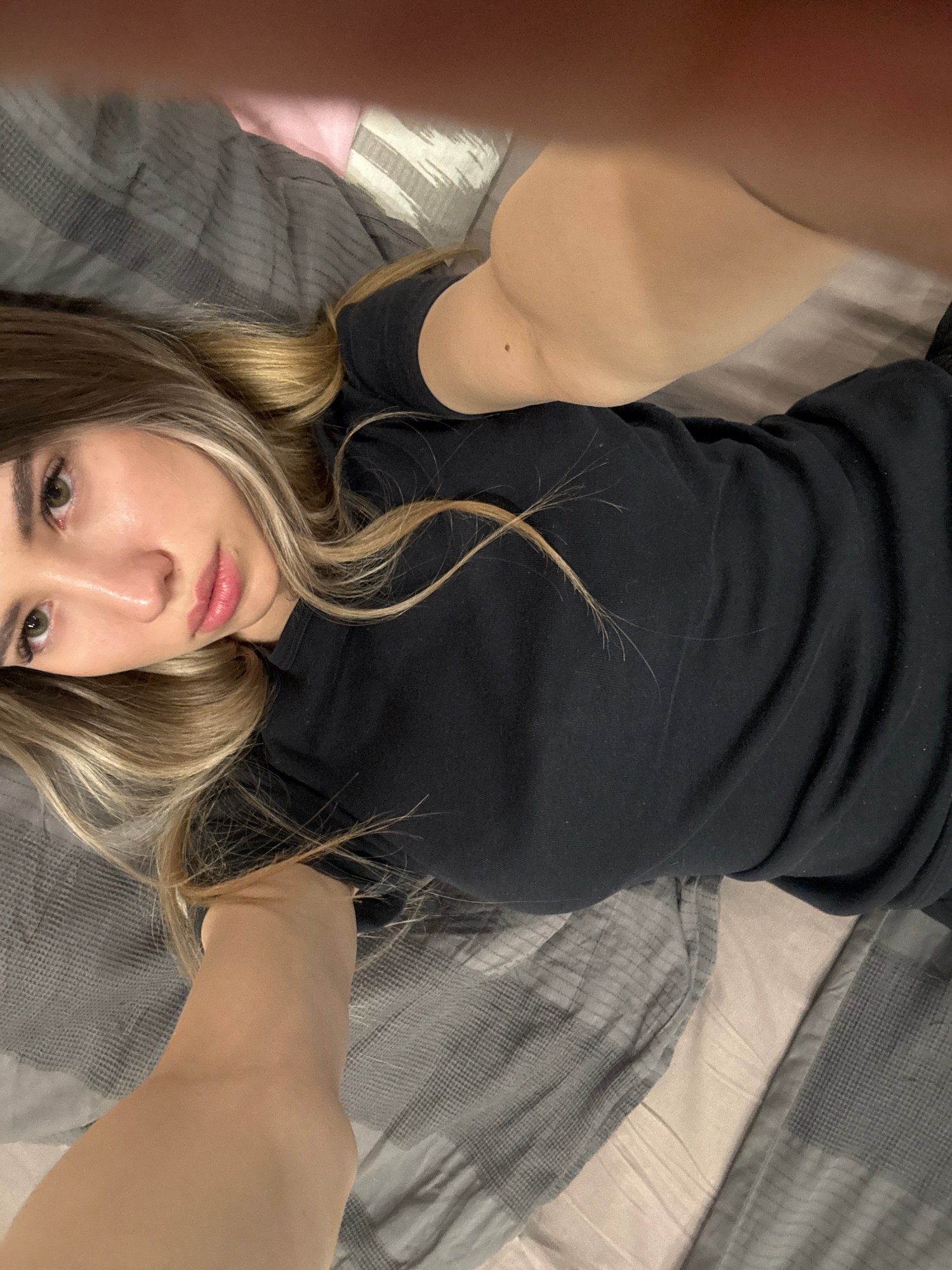 A person is lying on their back on a bed covered with a gray and beige patterned duvet. They are wearing a black long-sleeved shirt. The person's face is visible, showing blonde hair with dark roots,…read more