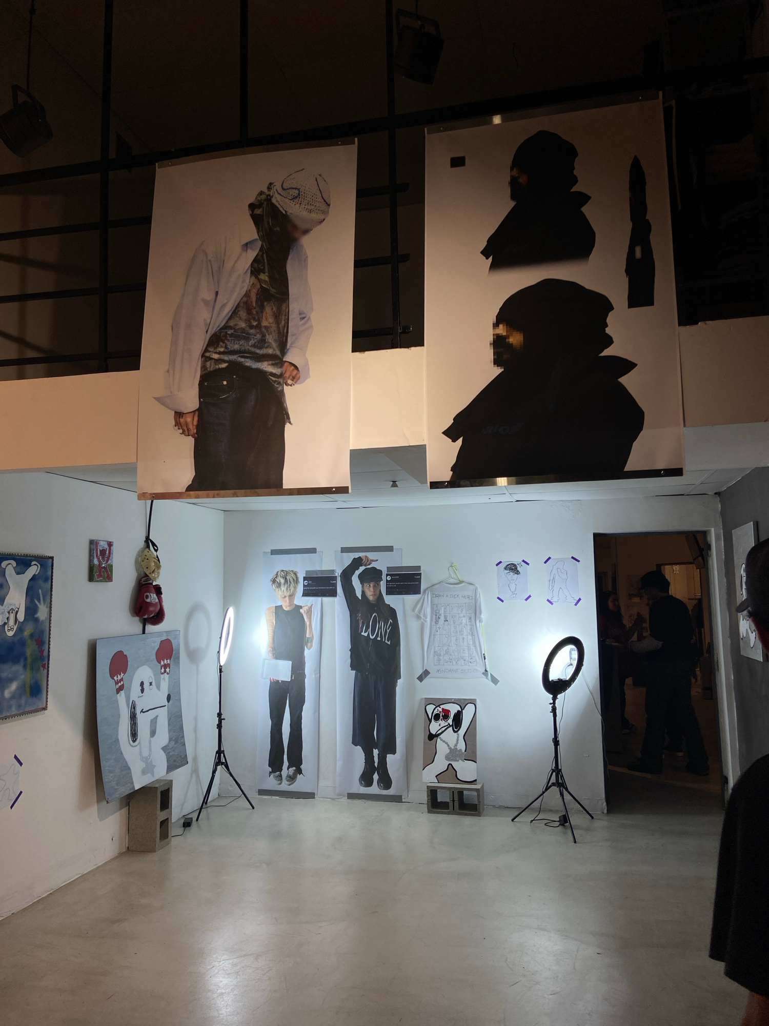 The image captures an indoor space in what appears to be an art exhibition or studio, possibly located in Buenos Aires, Argentina, given the style of art and architecture. The focus is on various artw…read more
