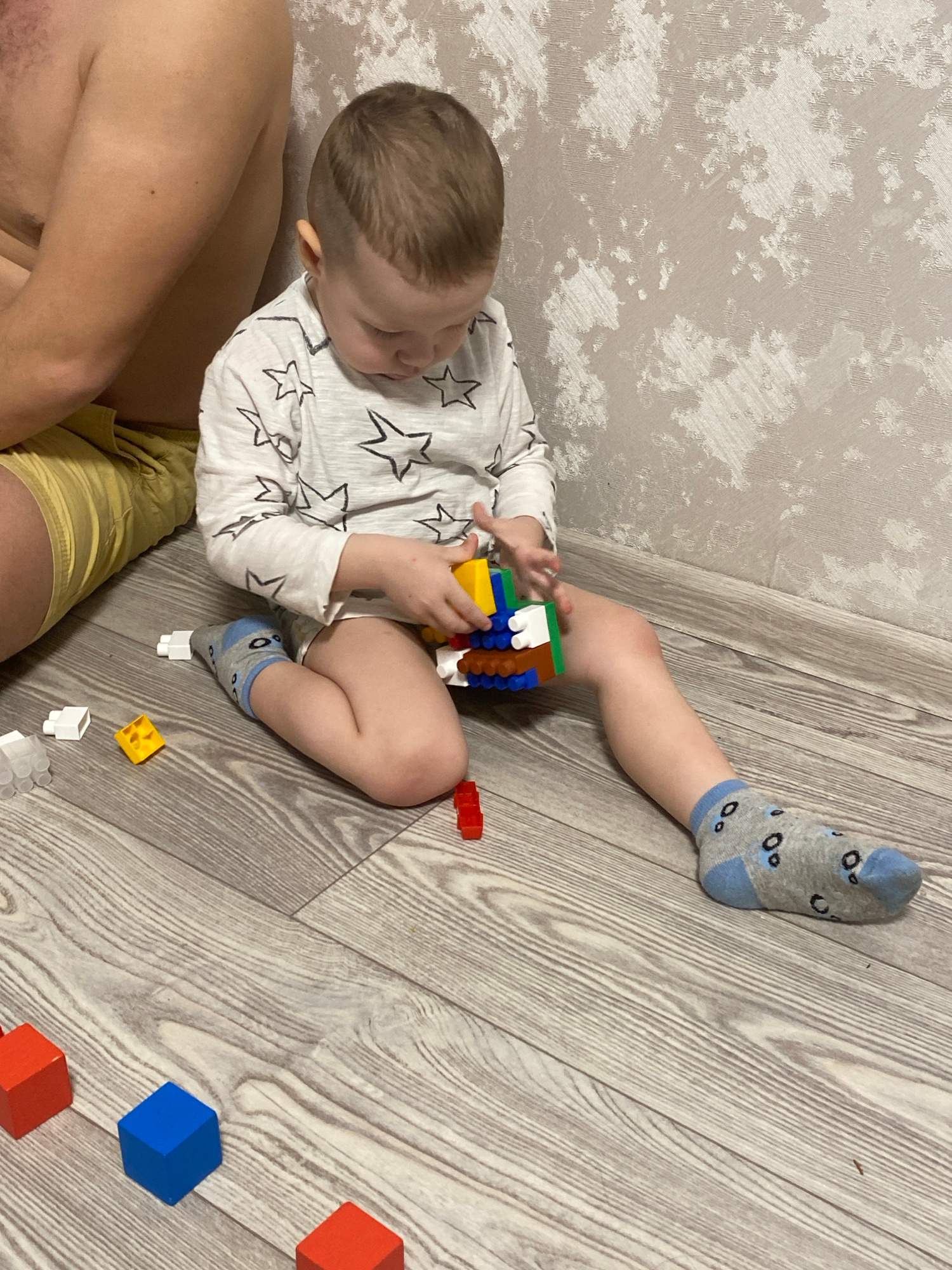 A child is sitting on a grey, wood-patterned floor and playing with colorful building blocks. The child is wearing a white, long-sleeved shirt with black stars and grey socks with light blue accents.…read more