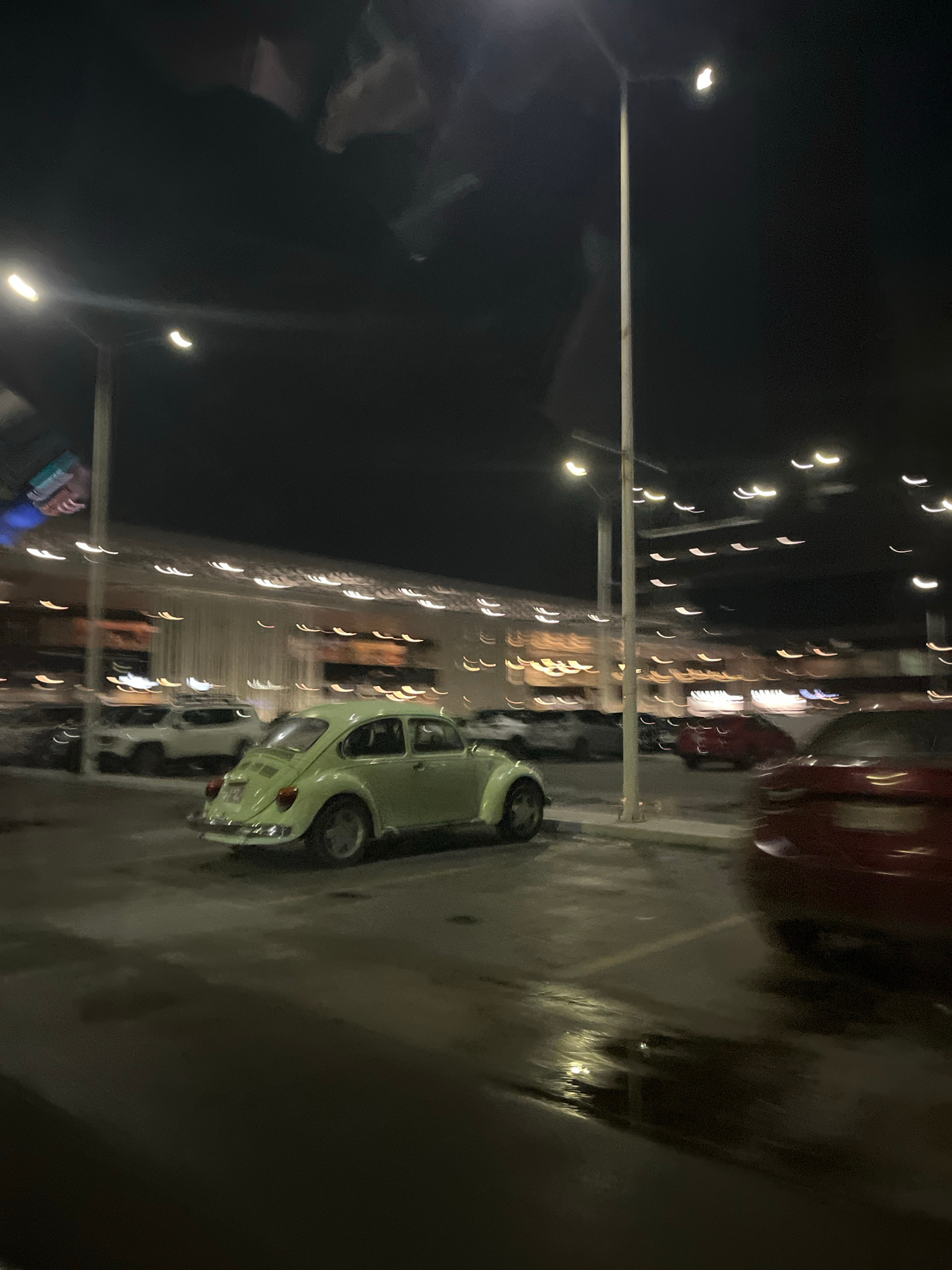 At night in Puebla, Mexico, a pale green Volkswagen Beetle is parked in a lot with wet pavement. Streetlights line the left side of the image, along with rows of blurred storefronts. A red car is park…read more