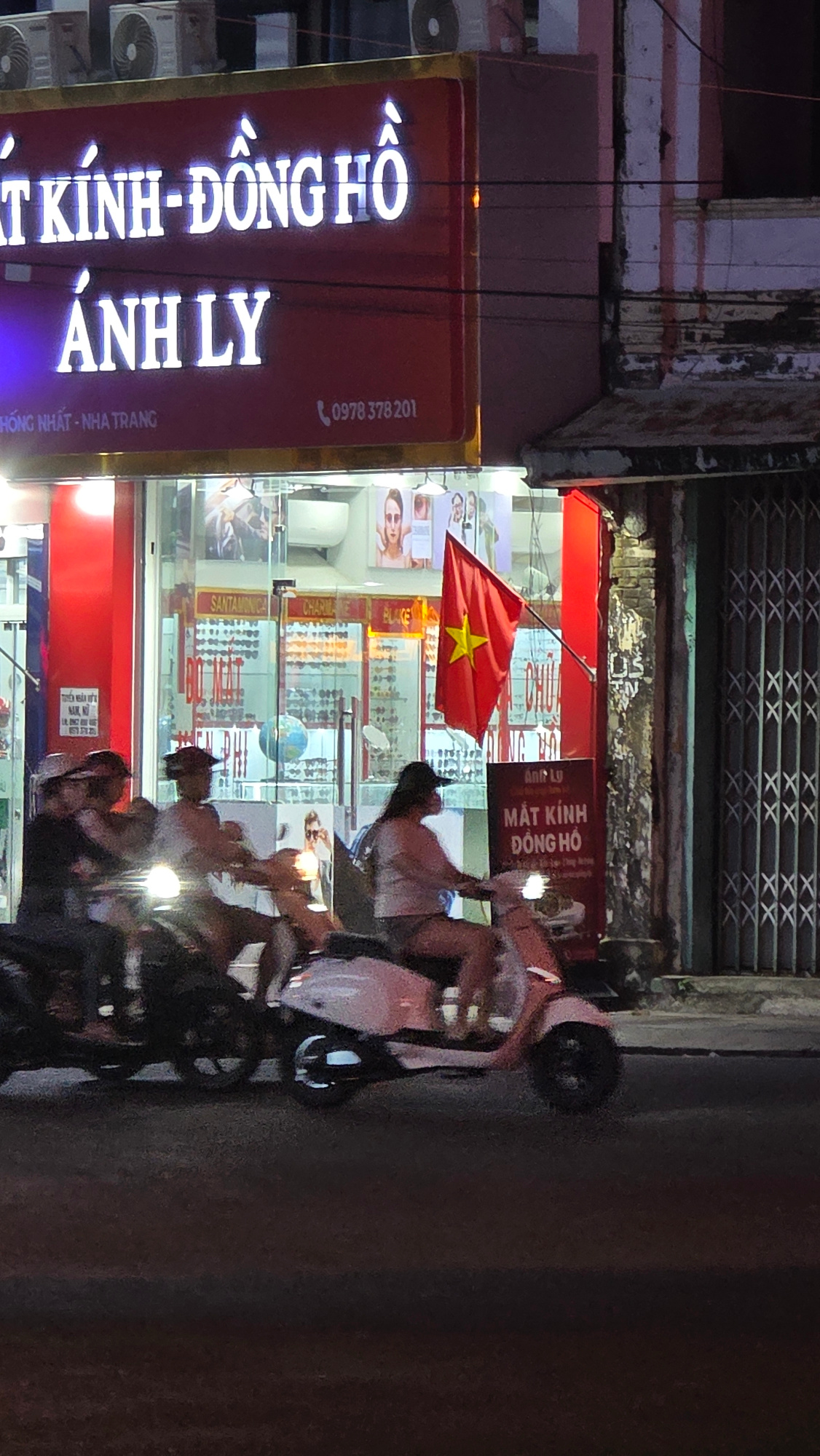 The scene depicts a street in Nha Trang, Vietnam, at night. An optics shop, "Ánh Ly Mắt Kính-Đồng Hồ" (Ánh Ly Eyewear-Watches), is prominently displayed. Its illuminated signage includes the phone num…read more